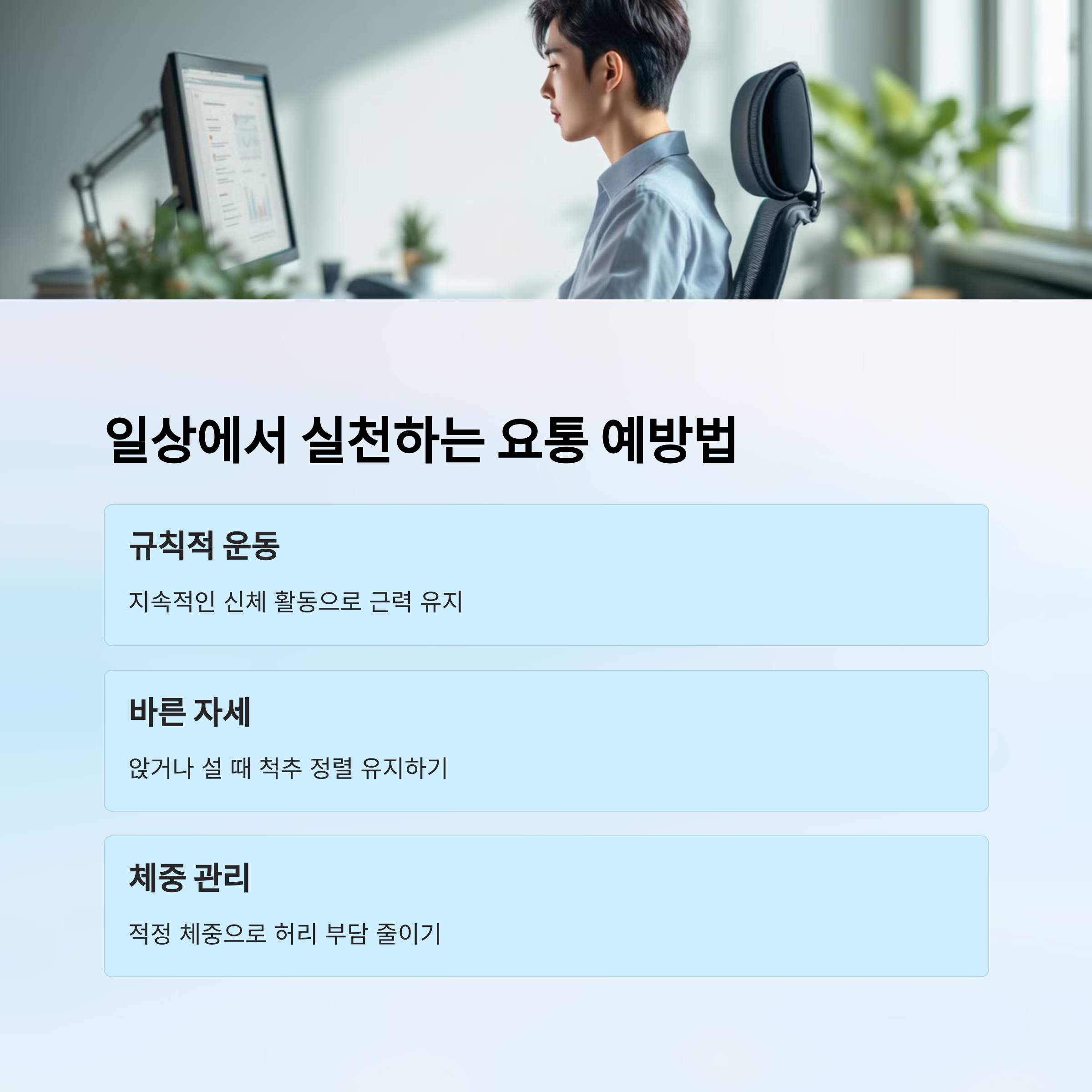 생활 습관 중 요통에 영향을 주는 대표적인 것들로는 ▶ 오래 앉아 있는 자세 ▶ 푹 꺼지는 소파 사용 ▶ 높은 베개 ▶ 다리 꼬기 ▶ 스마트폰 거북목 자세 등이 있어요. 이런 습관을 교정하면 허리가 편안해지는 걸 직접 느낄 수 있어요.