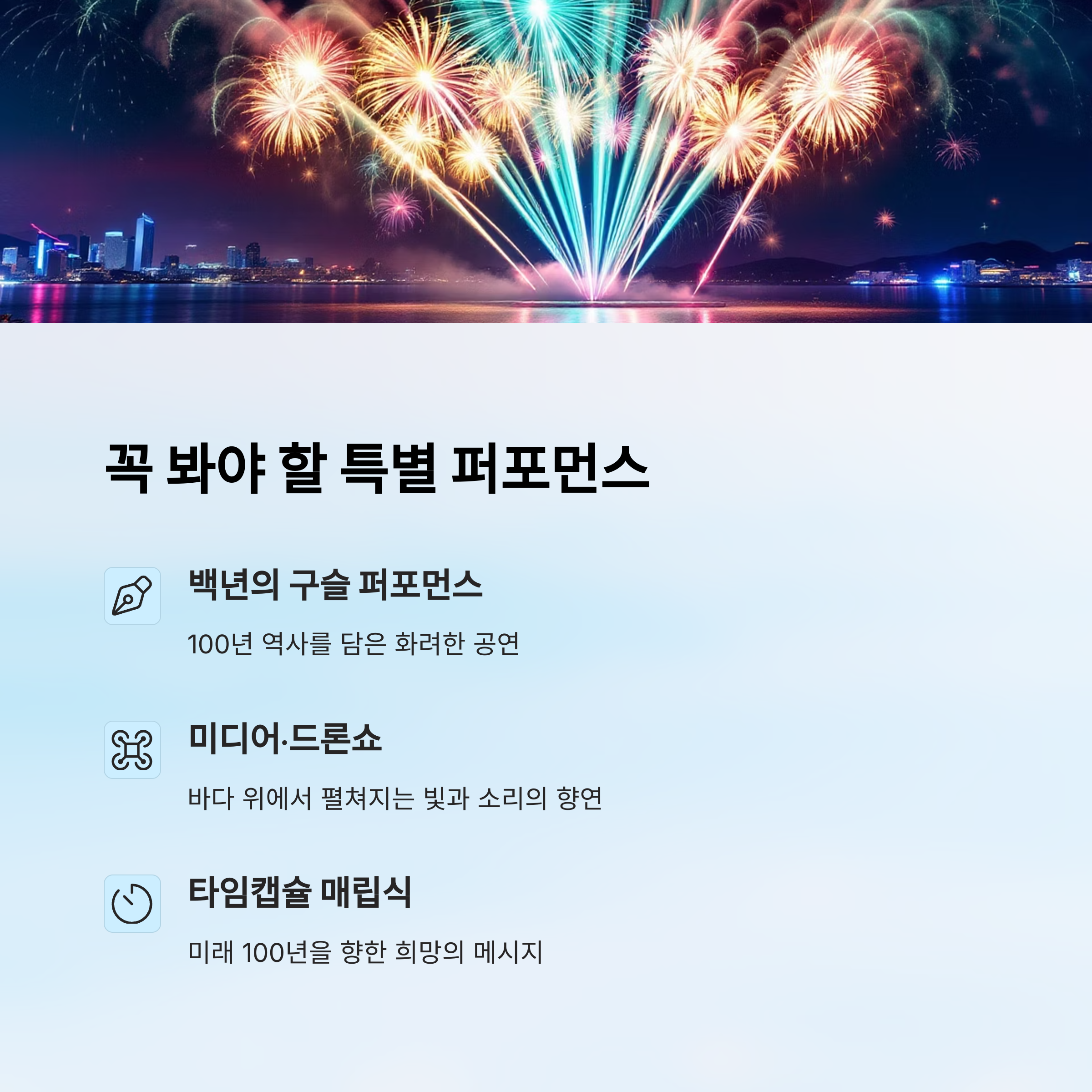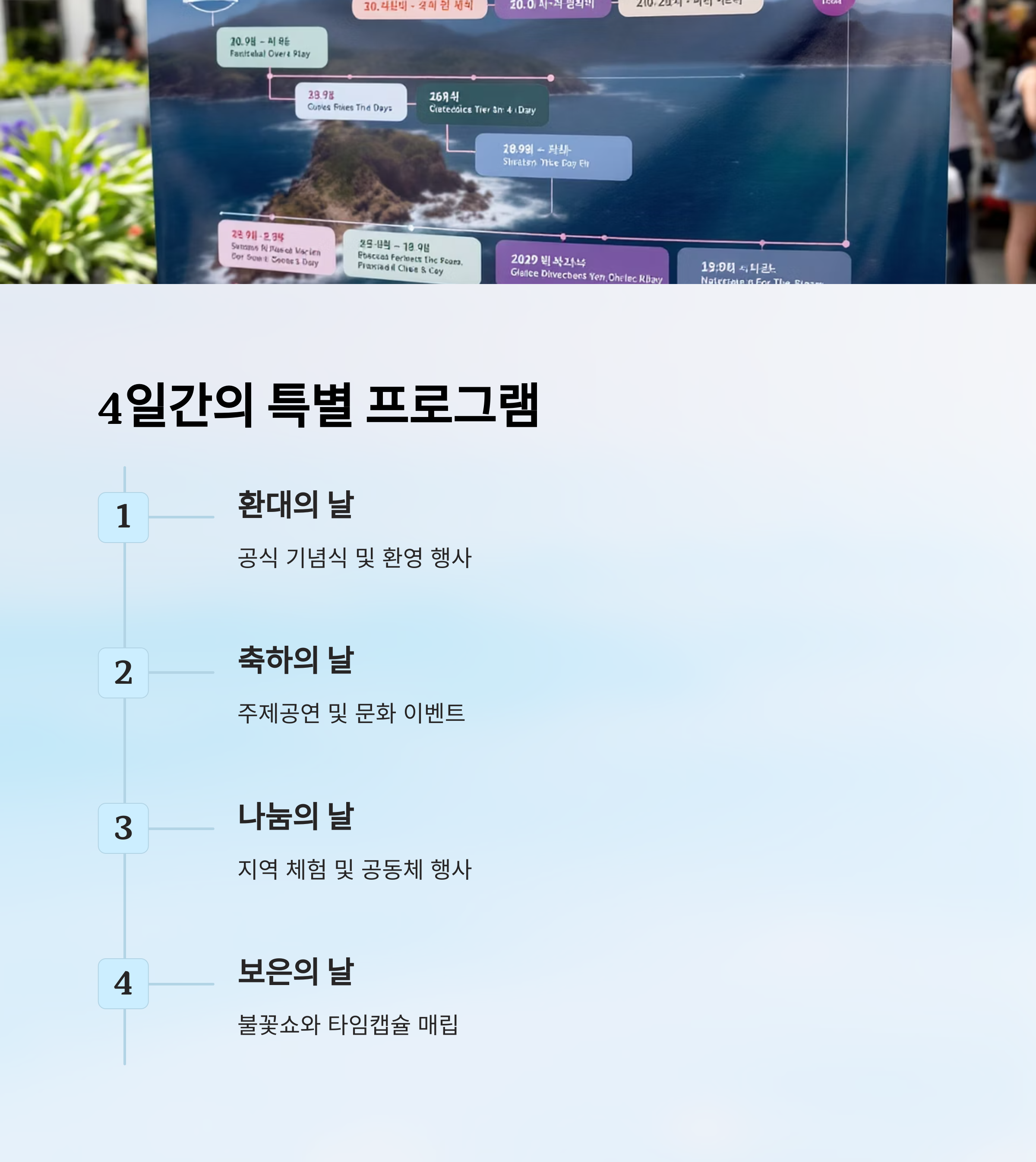 첫날인 '환대의 날'에는 공식 기념식과 함께 동백나무 식수, 타임캡슐 매립 등의 상징적 행사가 열리고, 멋진 불꽃쇼와 트론댄스, 드론쇼로 밤하늘을 수놓을 거예요.
