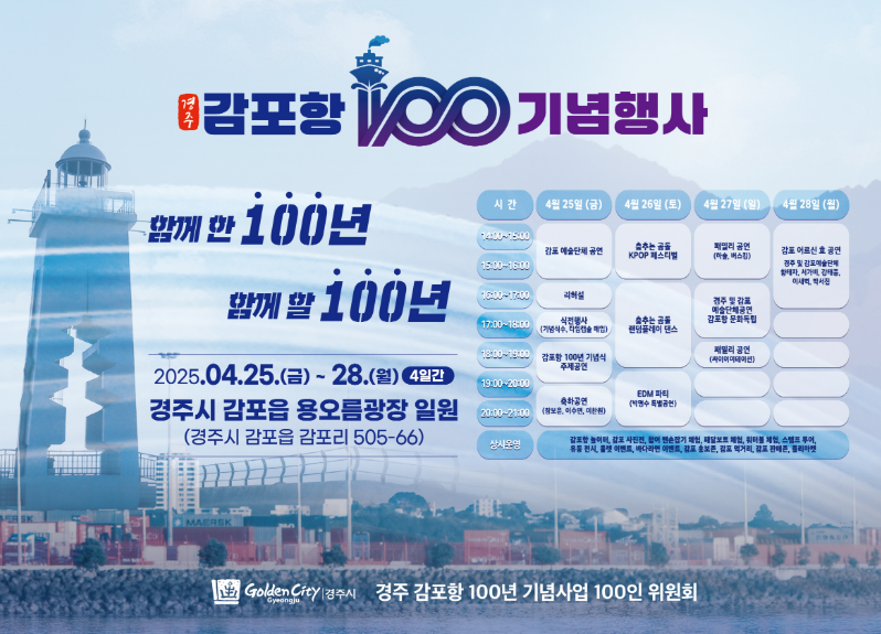 감포항은 조선시대부터 중요한 해양 거점이었고, 1925년 정식 개항한 이후 100년 동안 꾸준히 성장해 왔어요. 그 역사적 의미를 되새기며, 앞으로의 100년을 새롭게 시작하는 축제랍니다! 🛥️