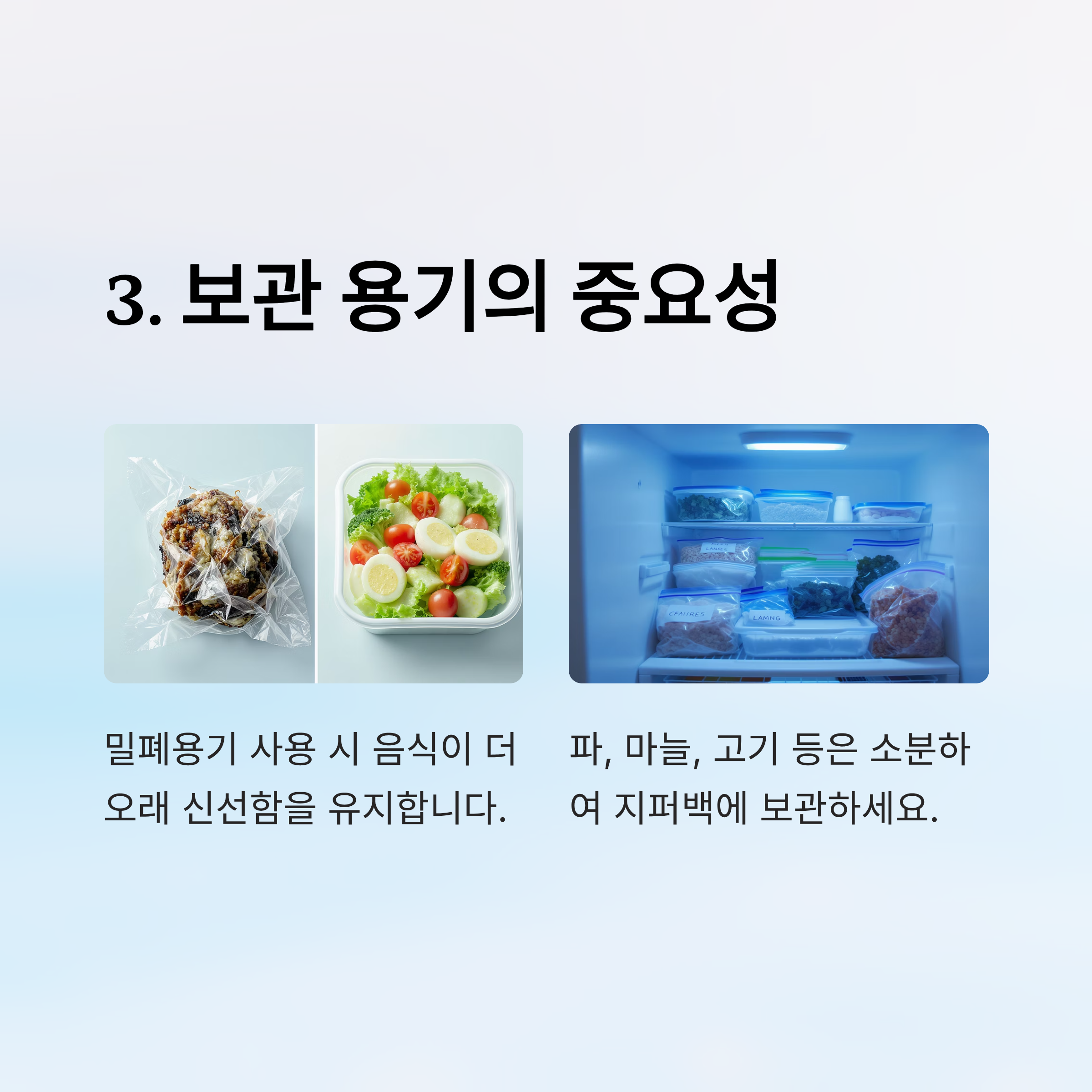✅ 반찬: 용도에 맞는 밀폐용기에 담아 공기 접촉 최소화