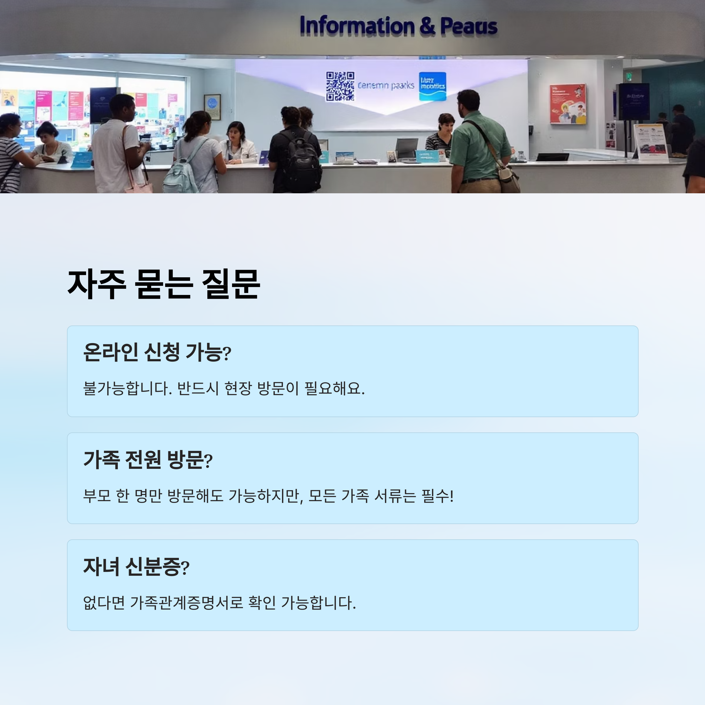 서류가 미비하면 현장에서 혜택을 받을 수 없기 때문에 꼭 사전에 확인하고 준비해오는 것이 좋아요. 특히 어린 자녀를 동반한 가족은 이동도 쉽지 않기 때문에, 한 번에 완료할 수 있도록 꼼꼼히 준비하세요! 👜