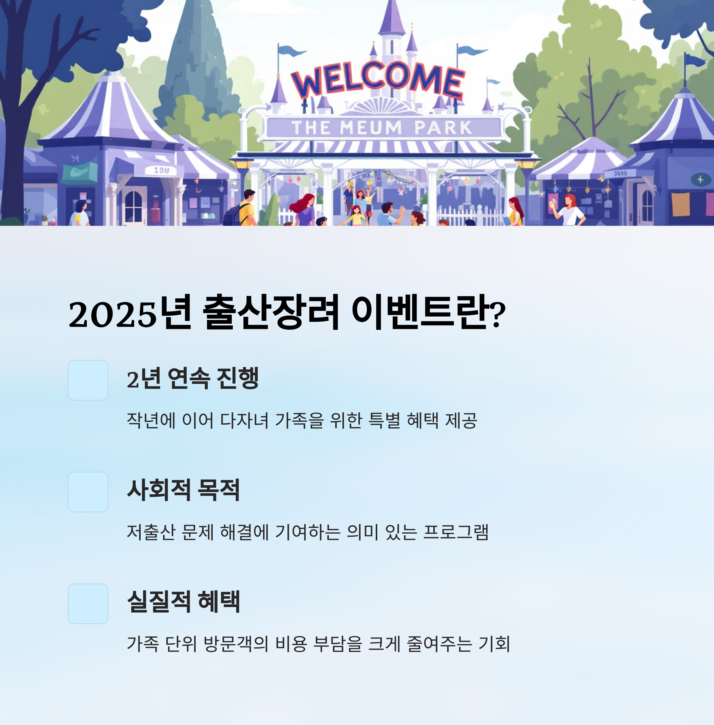 2025년에도 대전오월드는 가족 단위 방문객을 위해 특별한 출산장려 이벤트를 준비했어요. 이 이벤트는 단순한 프로모션이 아니라, 저출산 문제 해결에 기여하려는 사회적 목적을 담고 있답니다. 오월드는 작년에 이어 2년 연속으로 다자녀 가족을 위한 연간회원권 혜택을 확대했어요.