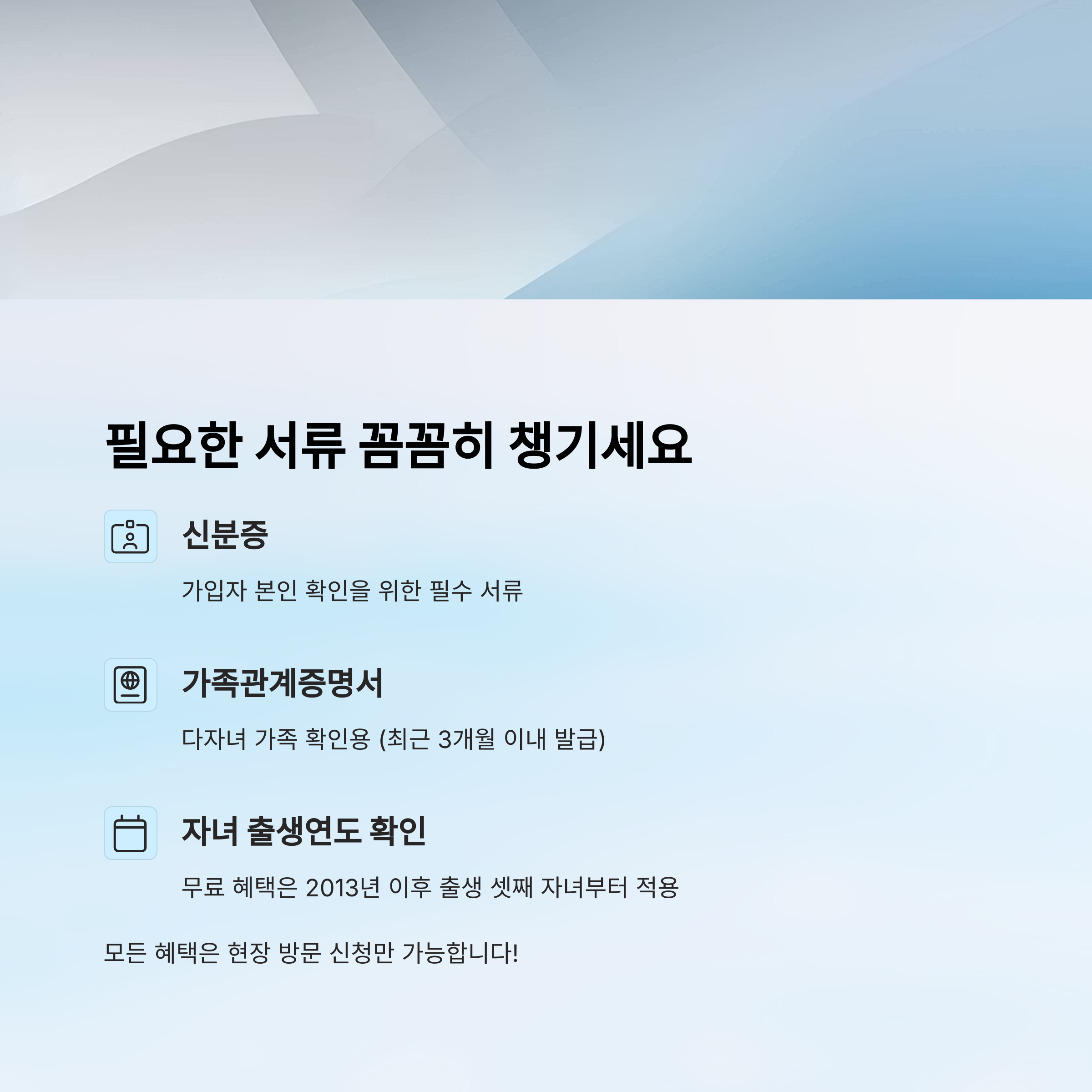 가장 기본적으로는 **신분증**이 필요하고, 여기에 **가족관계증명서**를 꼭 지참해야 해요. 이 서류를 통해 다자녀 여부, 자녀 수, 출생연도 등을 확인할 수 있기 때문이에요.