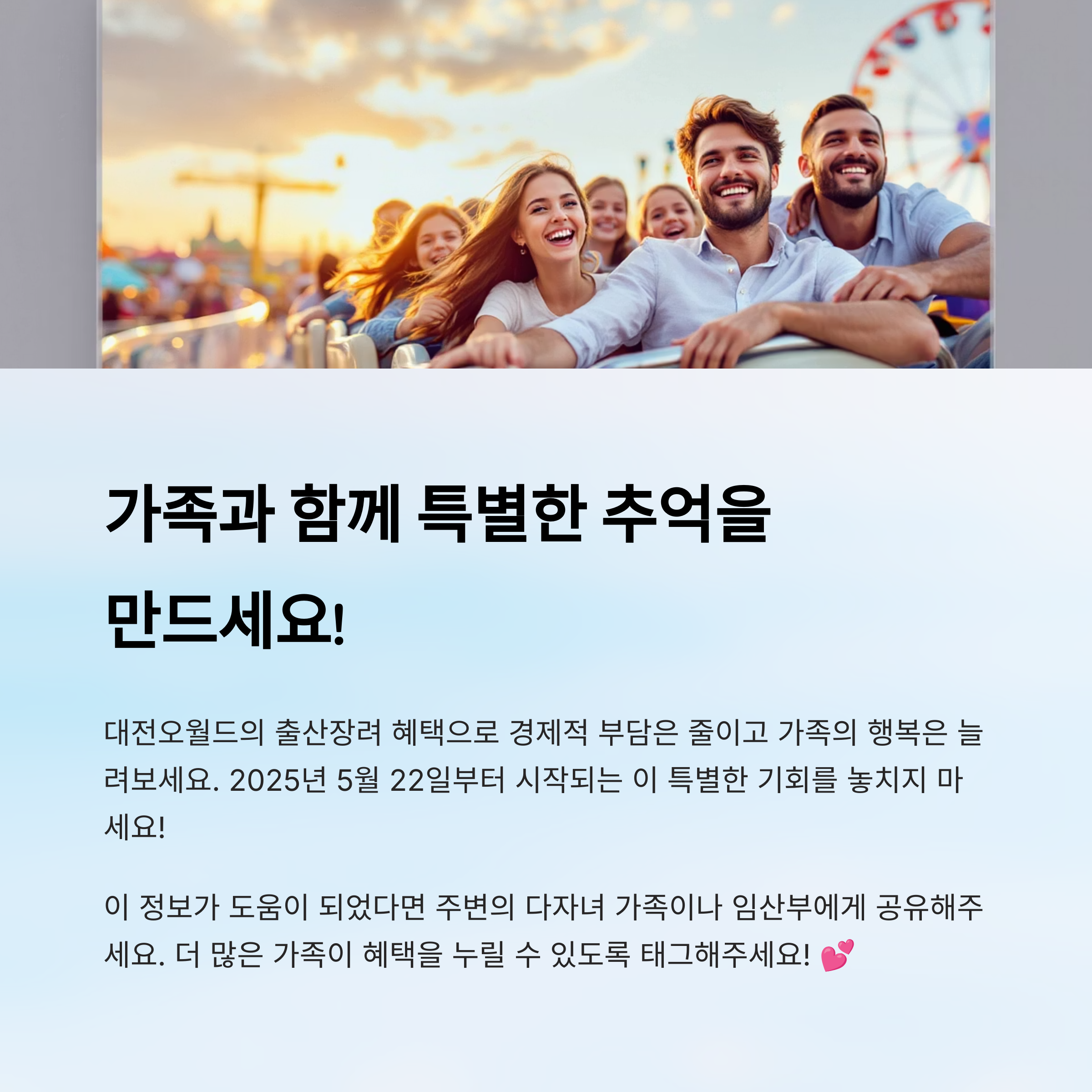 🌟 2025년에도 대전오월드가 가족을 위한 따뜻한 혜택을 준비했어요! 올해도 다자녀 가족을 위한 출산장려 이벤트가 돌아왔답니다. 작년에 이어 2년 연속으로 진행되는 이번 행사는 더 많은 가족에게 웃음을 선사하고, 육아에 대한 부담을 덜어주는 특별한 기회를 제공해요.