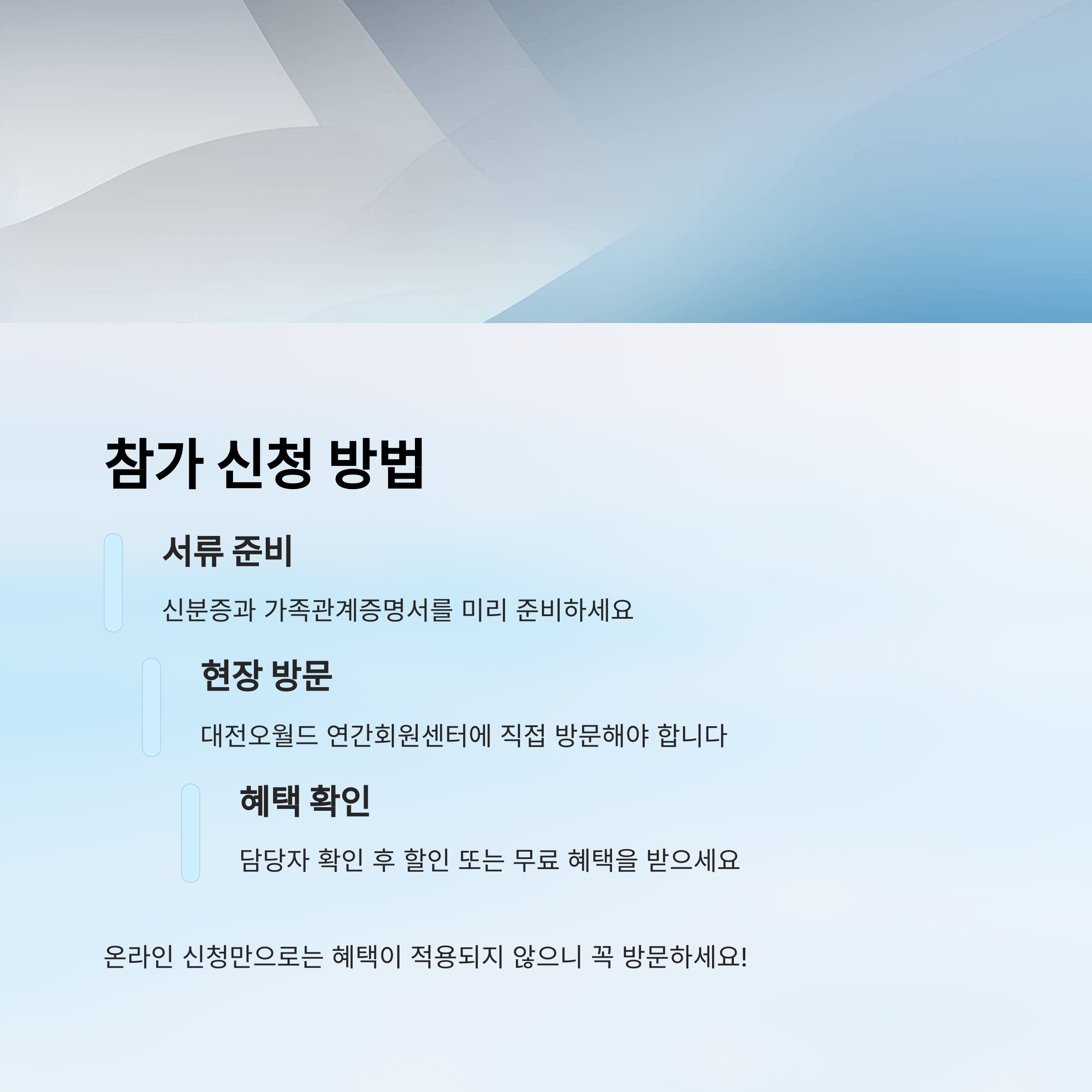 혜택을 받기 위해서는 온라인으로 신청만 하고 끝내는 방식이 아니라, 대전오월드 내 연간회원센터에 직접 방문해서 현장에서 확인 및 접수를 완료해야 해요. 방문 시 신분증과 가족관계증명서를 꼭 지참해야 해요.