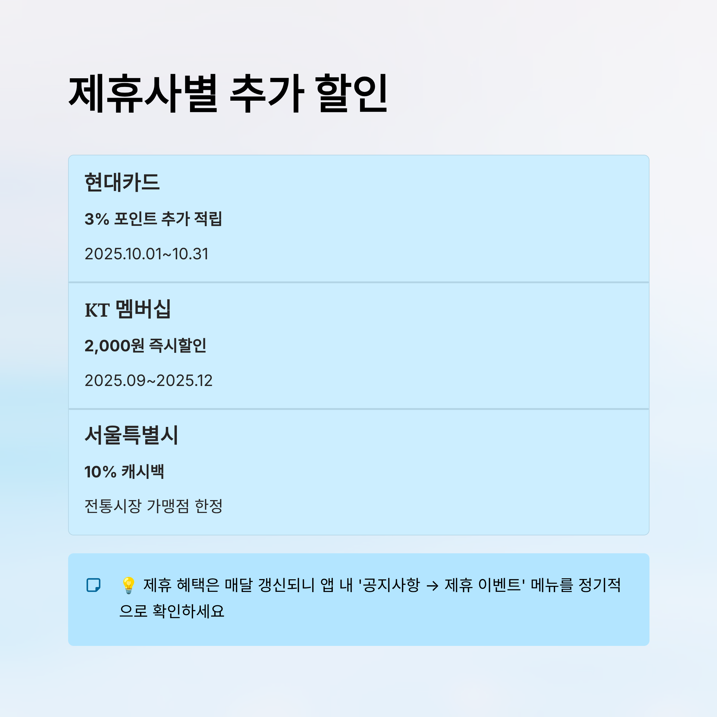 이 제휴 혜택은 매달 갱신되는 경우가 많아서 정기적으로 확인해야 해요. 최근에는 ‘서울사랑상품권’, ‘경기지역화폐’ 등과도 연계되어, 지역별 한정 추가할인 혜택이 적용되기도 했어요.