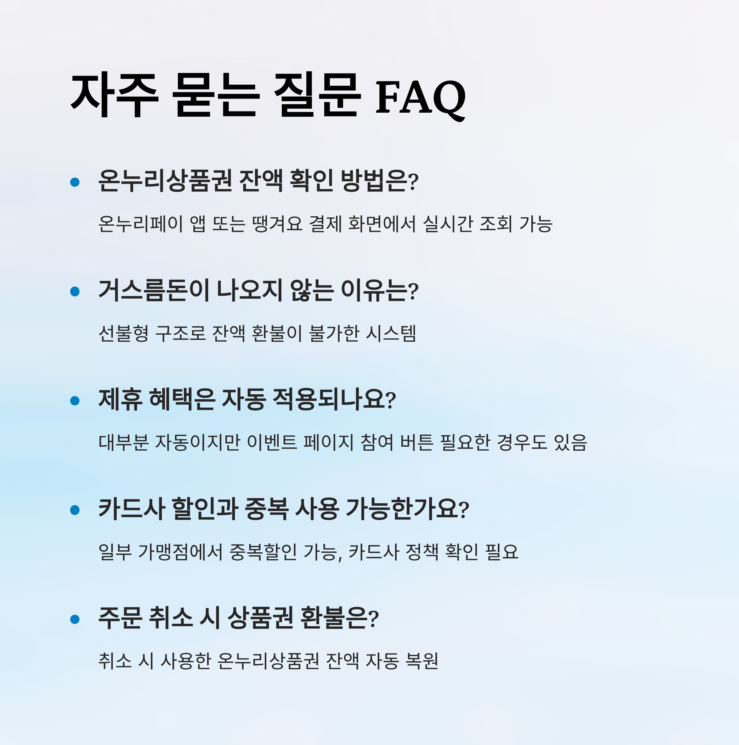 A8. 주문이 취소되면 사용한 온누리상품권 잔액이 자동으로 복원돼요.
