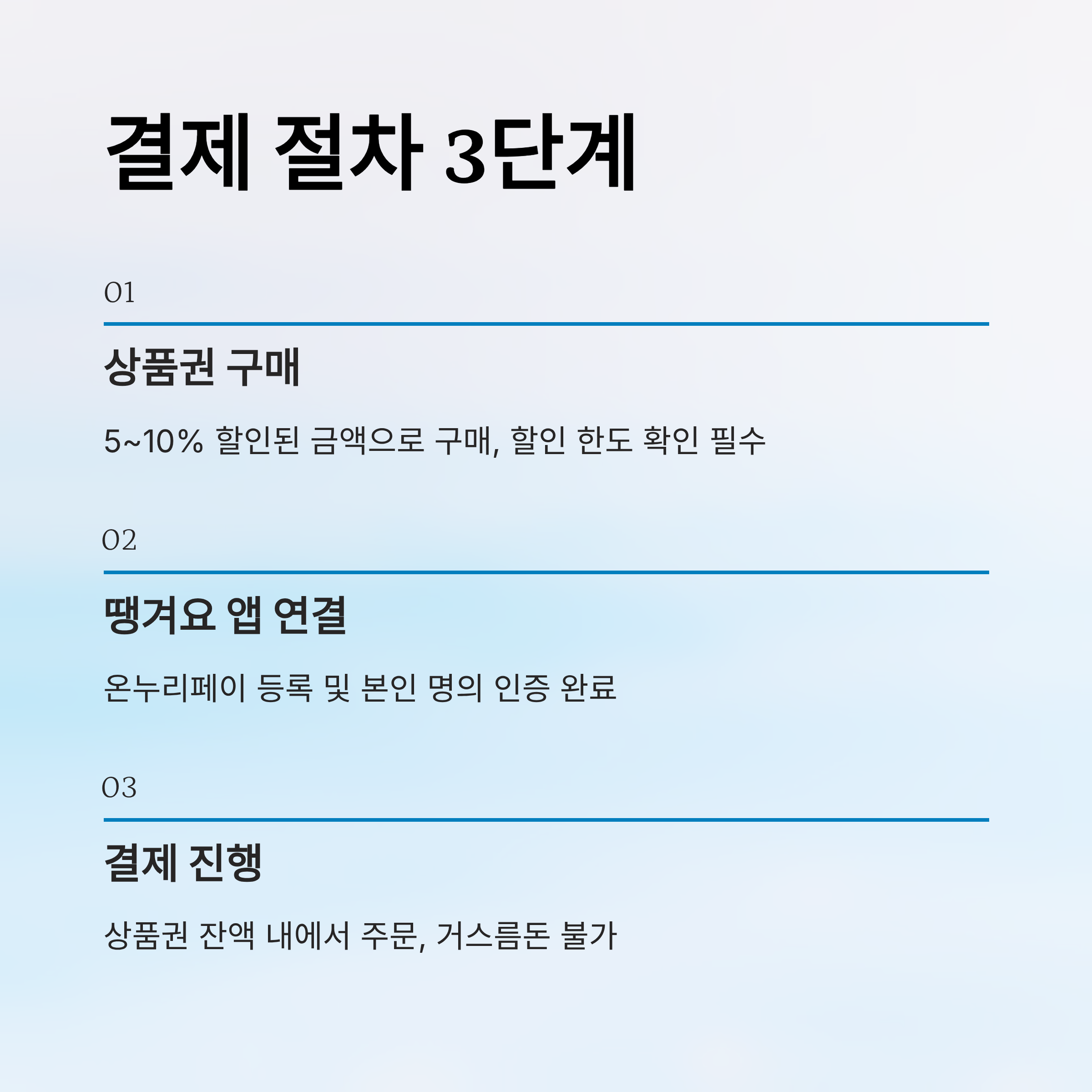 | 1. 상품권 구매 | 5~10% 할인된 금액으로 구매 | 할인 한도 확인 |