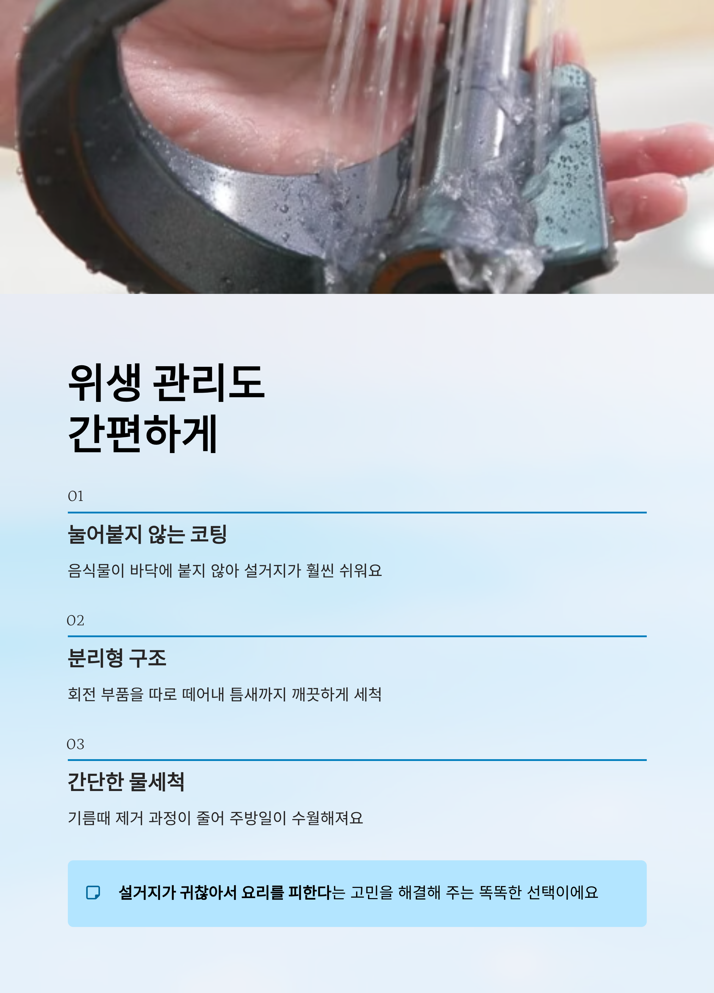 → 음식물이 눌어붙지 않아 세척이 간단해요