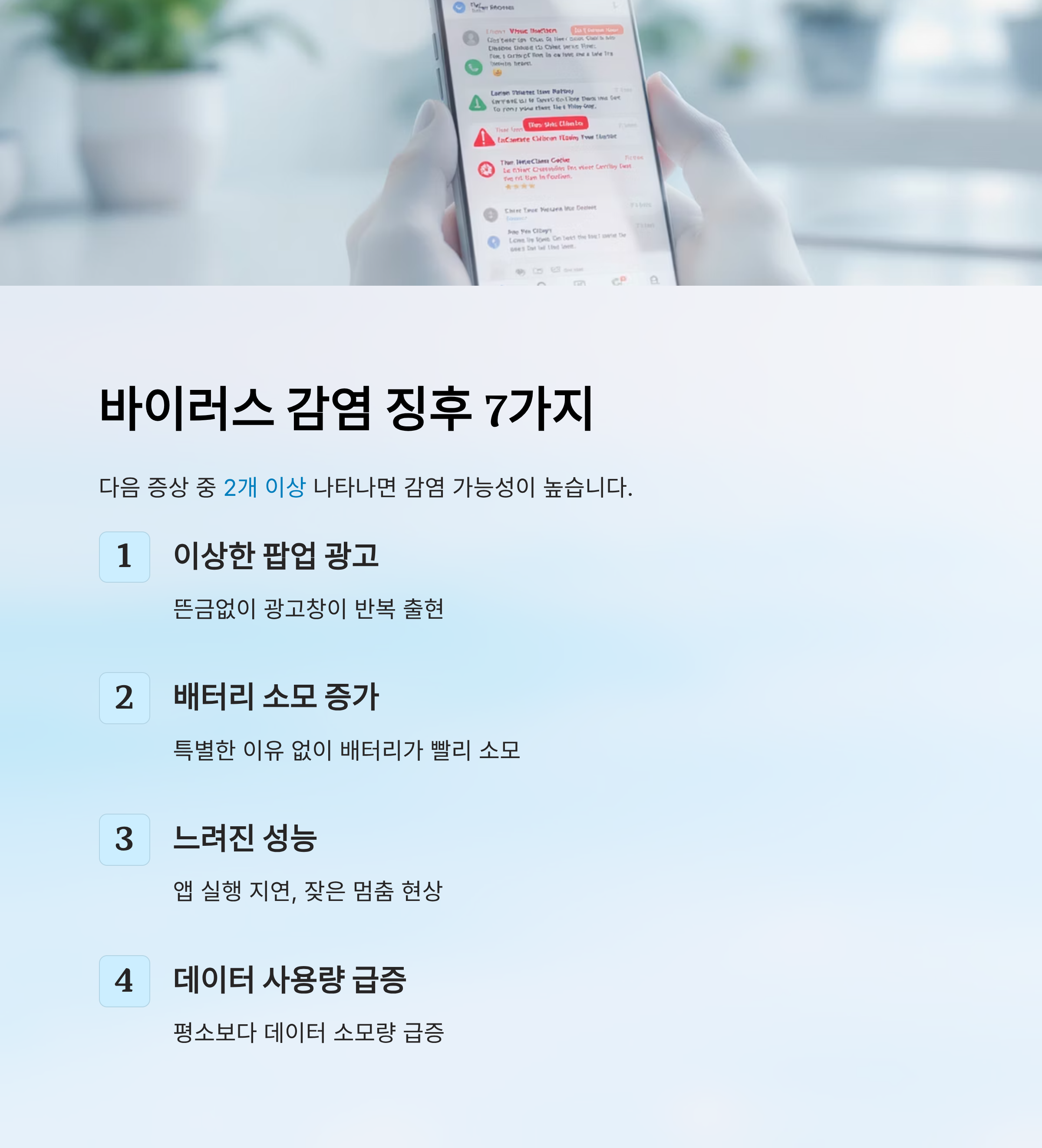 내 휴대폰이 바이러스에 감염되었는지 확인하려면 아래 **7가지 증상**을 체크해 보세요. 여러 징후가 동시에 나타난다면 감염 가능성이 높아요.