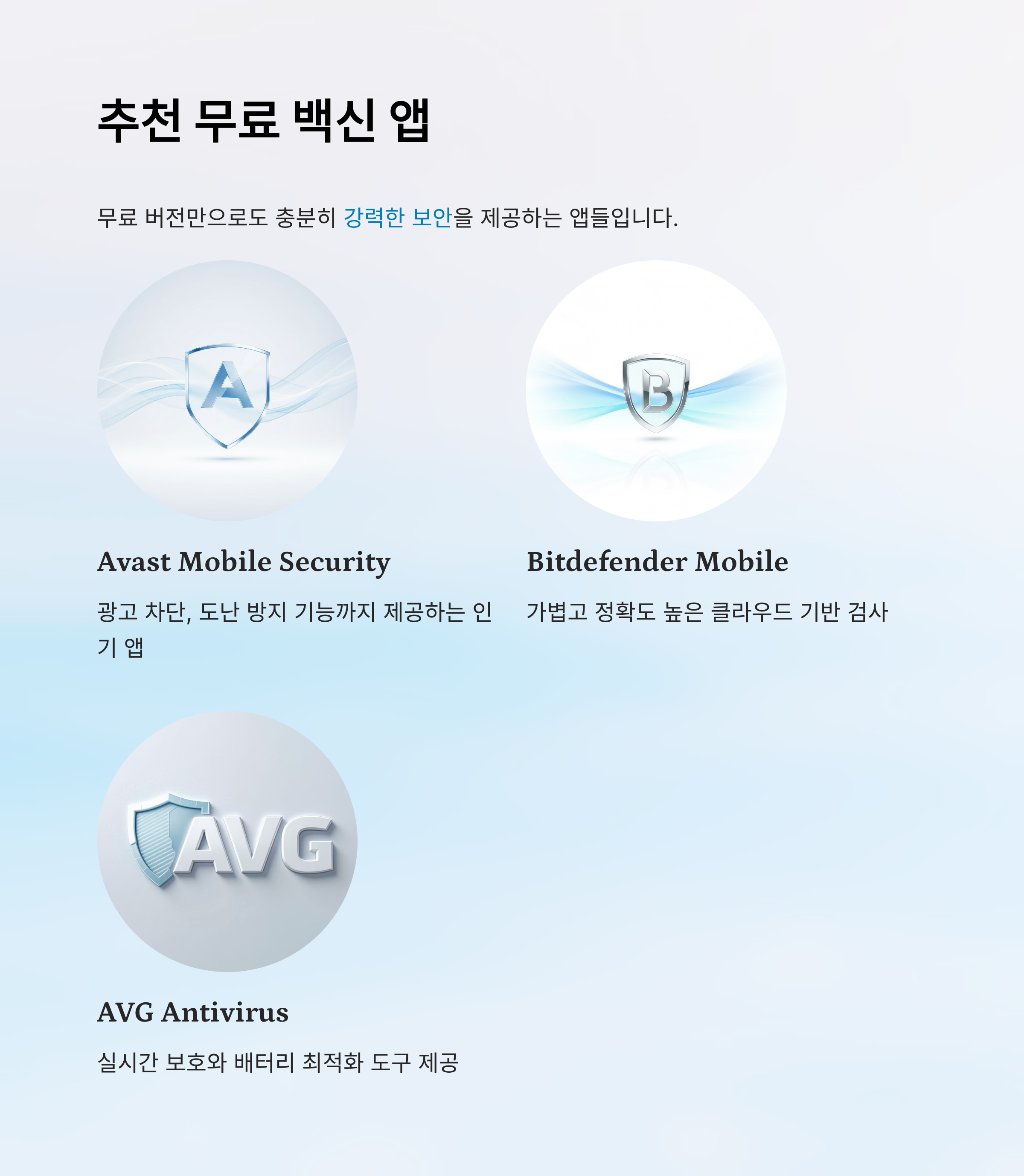 1. **Avast Mobile Security** - 광고 차단, 도난 방지 기능까지 갖춘 인기 앱이에요. 2. **AVG Antivirus** - 실시간 보호 기능이 강력해요. 배터리 최적화 도구도 제공돼요. 3. **Bitdefender Mobile Security (무료 버전)** - 가볍고 정확도가 높아 많은 사용자가 애용해요.