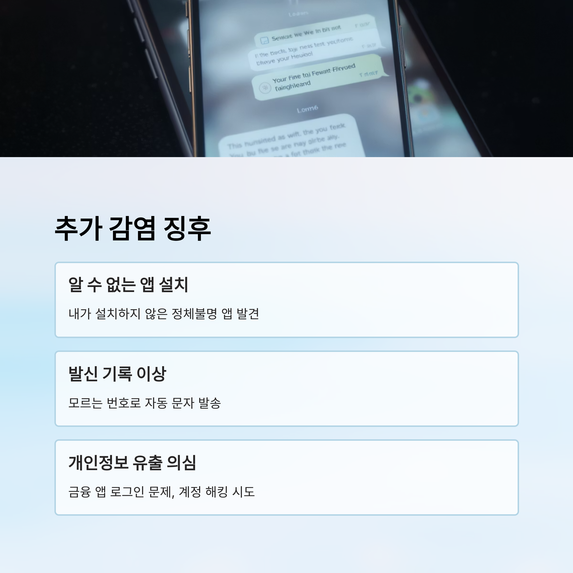 - 검사가 끝난 후에도 이상 증상이 지속되면 **초기화**를 고려하세요. - 의심스러운 링크 클릭 금지, 공식 앱스토어 외 출처 앱은 설치하지 마세요. - 정기적으로 **백신 앱**으로 검사를 수행하는 것이 좋아요.