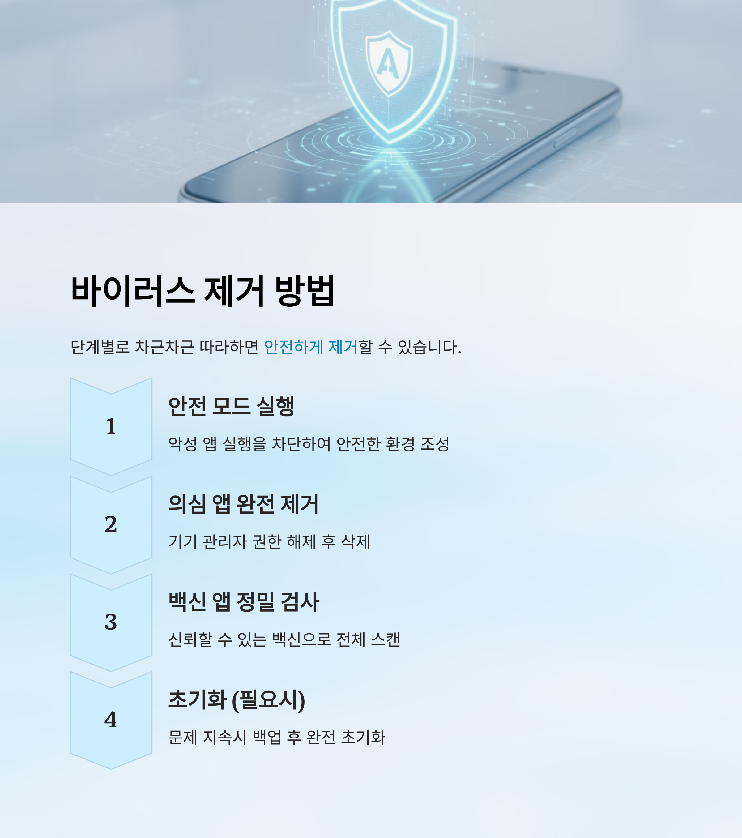 | 1단계 | 안전 모드 진입 | 의심 앱 삭제 |