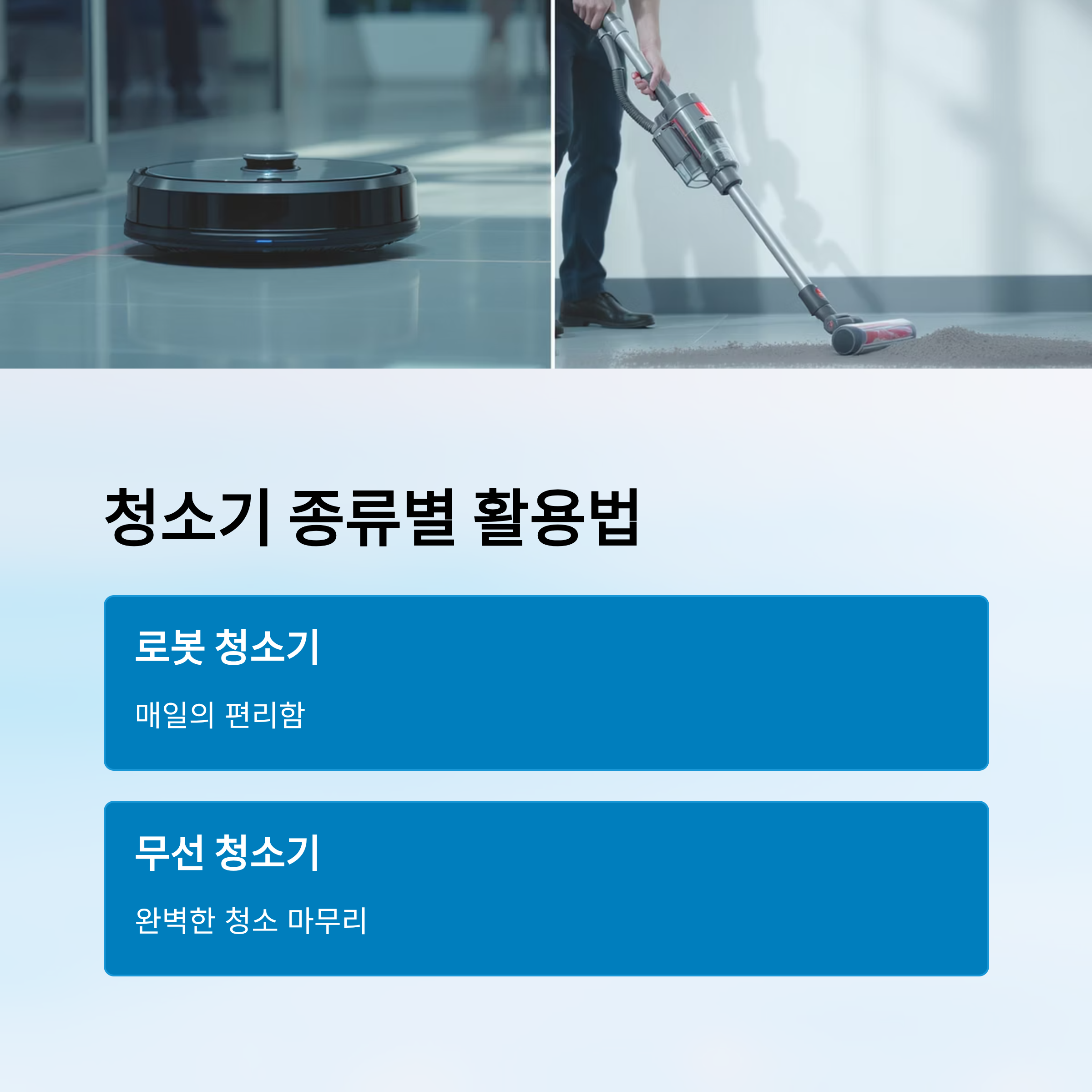 로봇 청소기는 매일의 편리함을, 무선 청소기는 주기적인 완벽함을 제공해요.