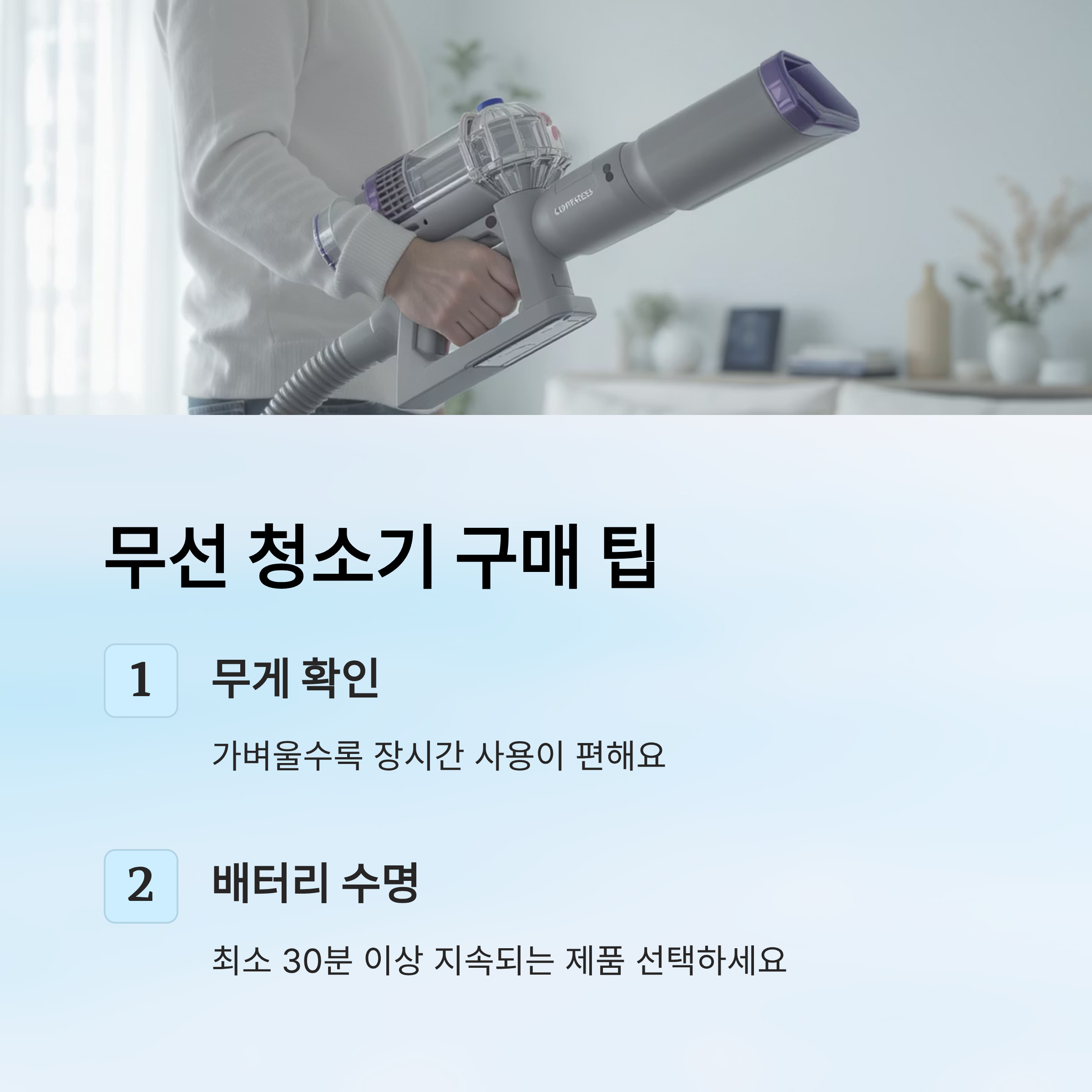 무선 청소기를 고를 때는 배터리 수명과 무게를 꼭 따져봐야 해요.