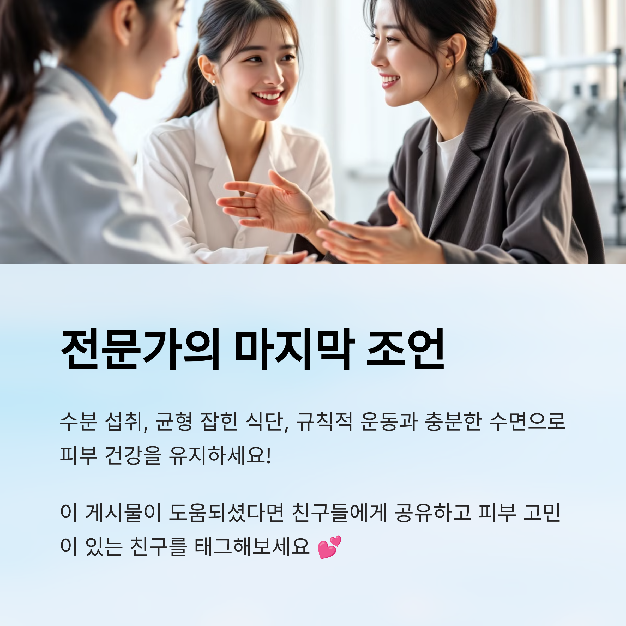 피부과 전문의와 뷰티 전문가들이 공통적으로 강조하는 건 “꾸준함과 피부 이해”예요. 피부는 하루아침에 좋아지지 않기 때문에 루틴의 일관성이 정말 중요하죠.