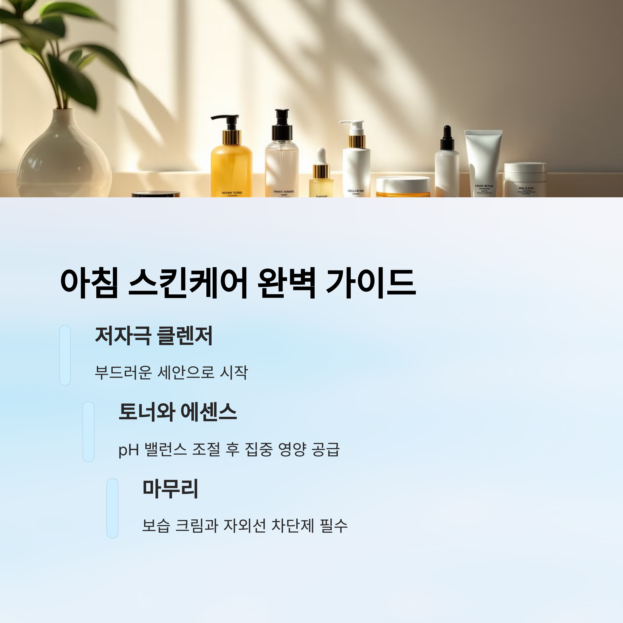아침엔 가벼운 클렌징 → 토너 → 수분앰플 → 비타민C 세럼 → 수분크림 → 자외선차단제 순서가 좋아요.