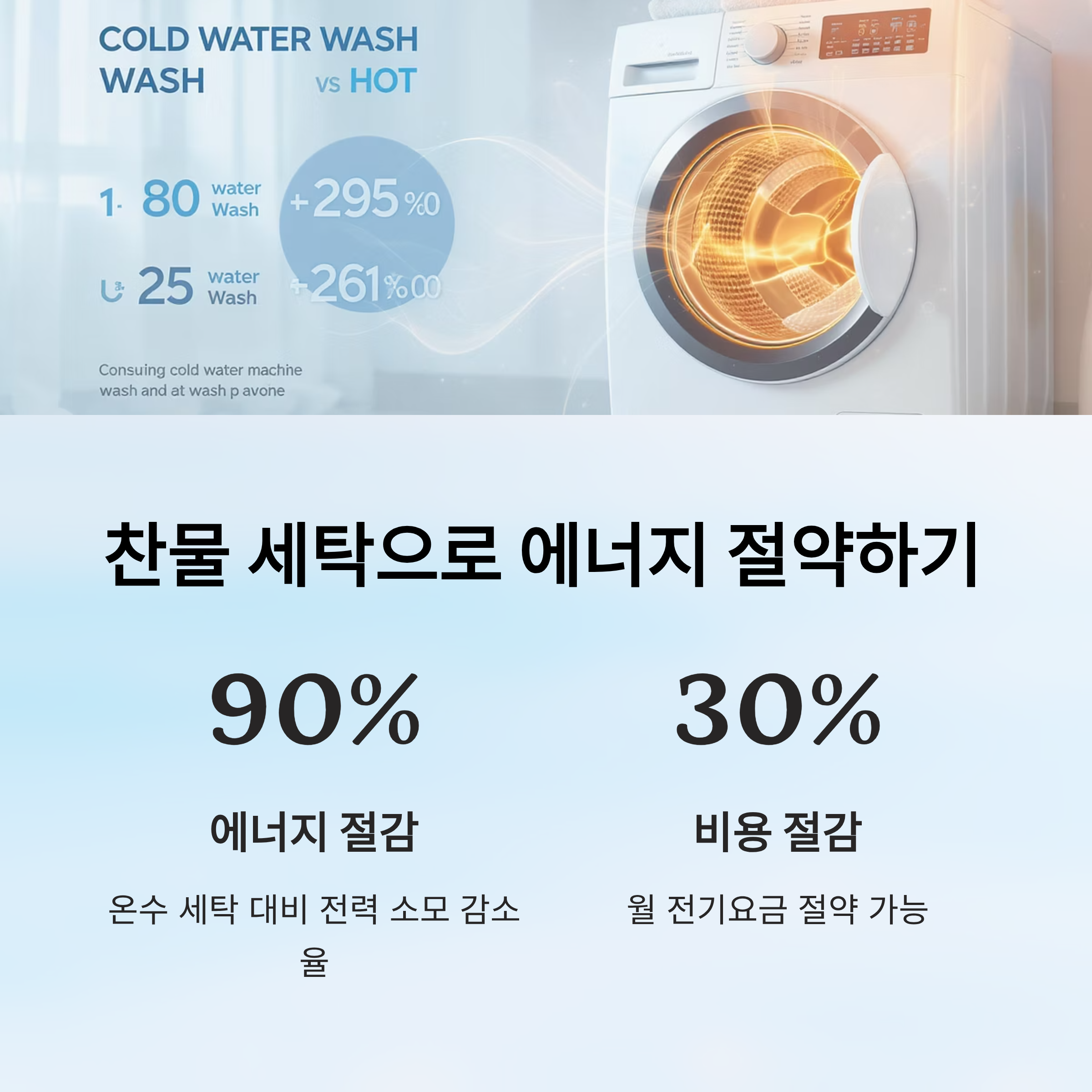 - 찬물 세탁 생활화: 전기 소모의 90%가 물을 데우는 데 쓰여요. 온수 세탁 대신 찬물로 돌리는 습관을 들이세요.