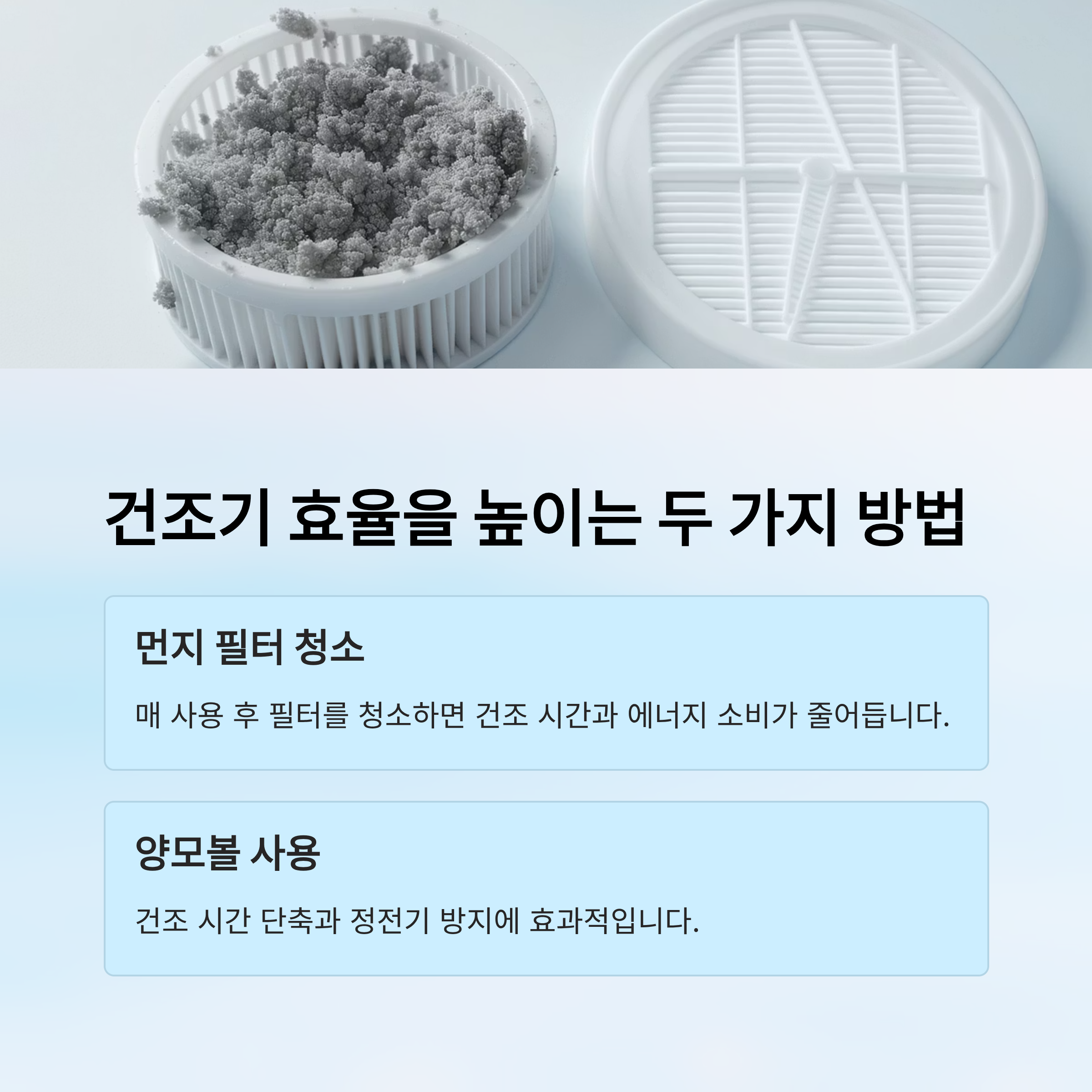 - 먼지 필터 매번 청소: 필터에 먼지가 가득하면 공기 순환이 안 돼서 건조 효율이 떨어져요. 결국 건조 시간이 길어지고 전기 낭비로 이어집니다. 귀찮더라도 매번 청소하는 게 좋아요.