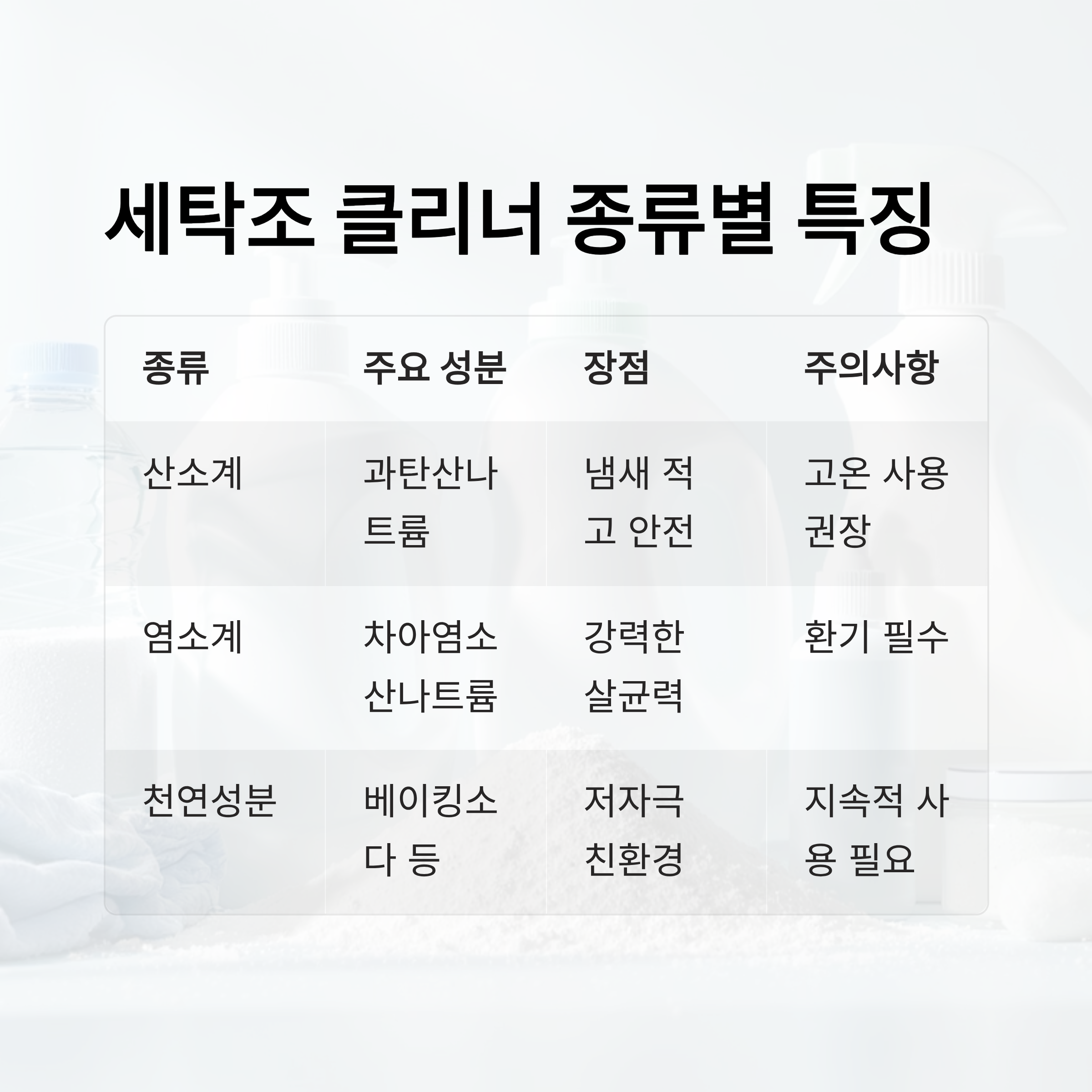 | 산소계 | 과탄산나트륨 주성분 | 냄새 적고 안전함 | 고온 사용 권장 |