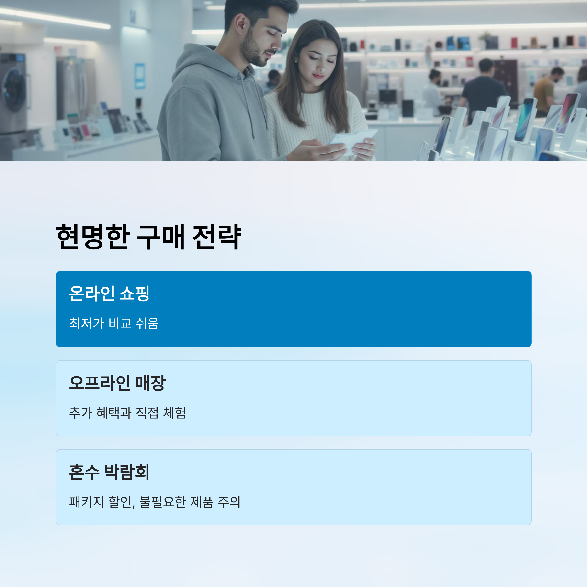 A5. 대형 가전은 삼성/LG 같은 오프라인 매장에서 패키지 혜택을 받고, 소형 가전은 쿠팡 같은 온라인 쇼핑몰에서 개별적으로 구매하는 것이 더 저렴할 수 있습니다.