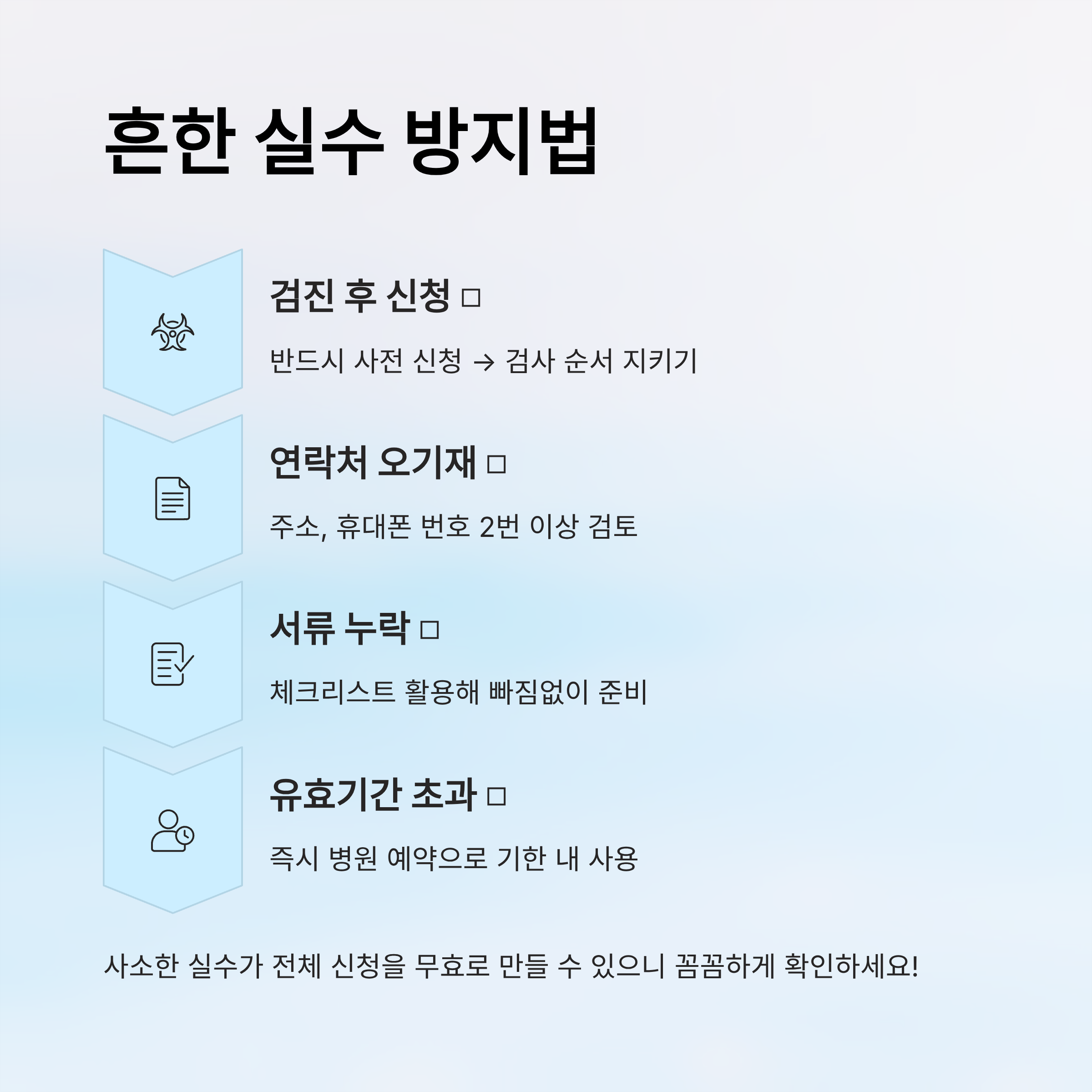 첫 번째 실수는 신청 전에 건강검진을 먼저 받는 것이에요. 일부 분들은 “건강검진 받았는데 지원금은 따로 신청해야지~”라고 생각하시는데, 순서가 반대예요! 반드시 사전 신청 → 검사 순서를 지켜야 해요.