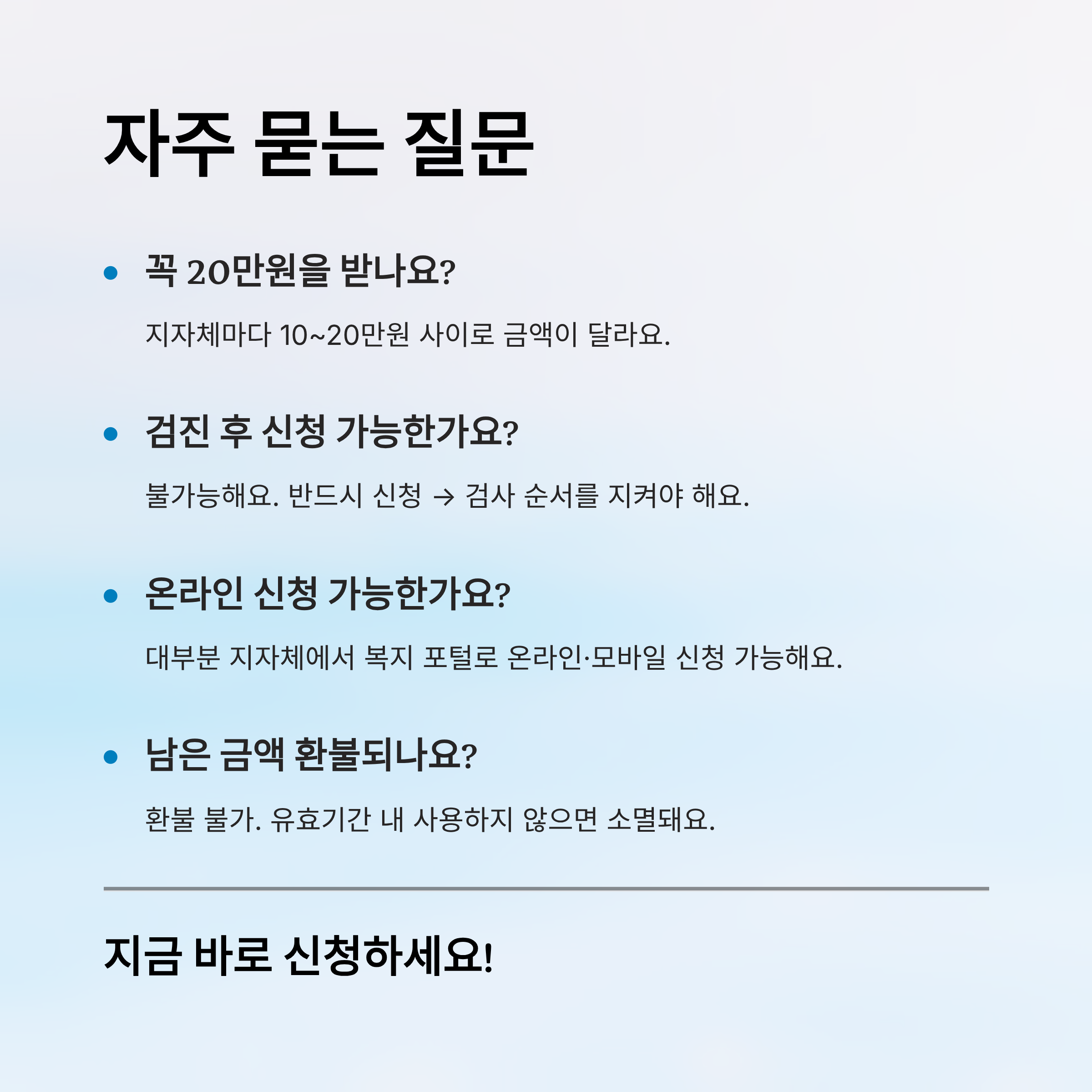 A1. 지자체마다 금액이 다를 수 있어요. 보통 10~20만 원 사이로, 거주 지역과 대상 조건에 따라 달라져요.