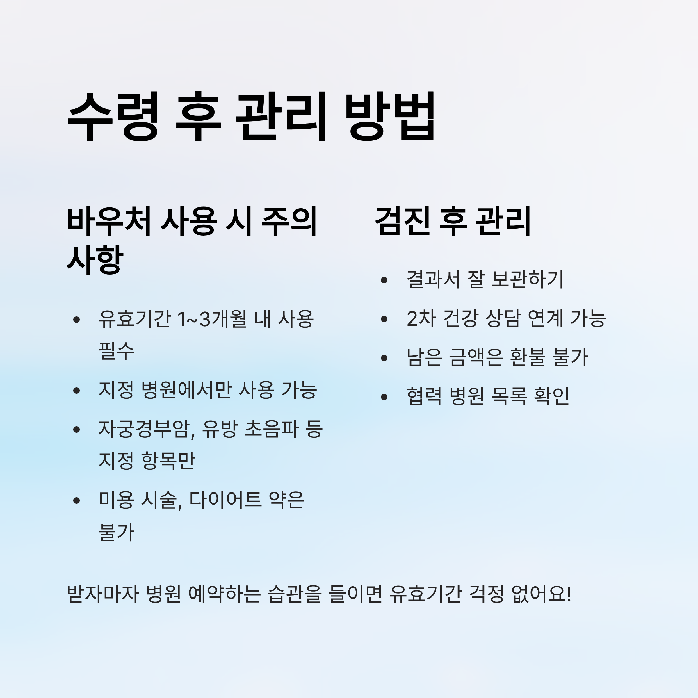 바우처는 유효기간이 정해져 있어서 보통 1~3개월 이내에 반드시 사용해야 해요. 이 기간이 지나면 자동 소멸되기 때문에, 받자마자 병원 예약부터 하는 게 좋아요! 👩⚕️
