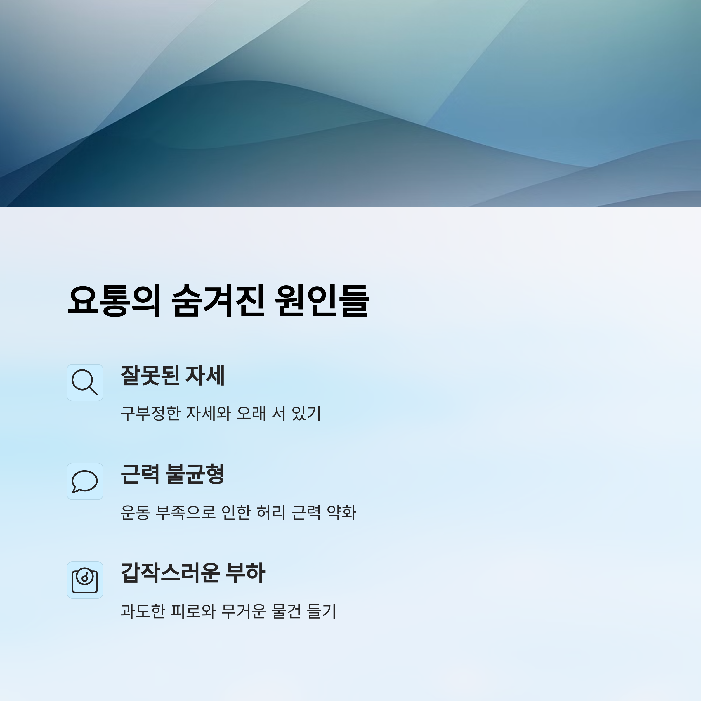 생활 습관 중 요통에 영향을 주는 대표적인 것들로는 ▶ 오래 앉아 있는 자세 ▶ 푹 꺼지는 소파 사용 ▶ 높은 베개 ▶ 다리 꼬기 ▶ 스마트폰 거북목 자세 등이 있어요. 이런 습관을 교정하면 허리가 편안해지는 걸 직접 느낄 수 있어요.