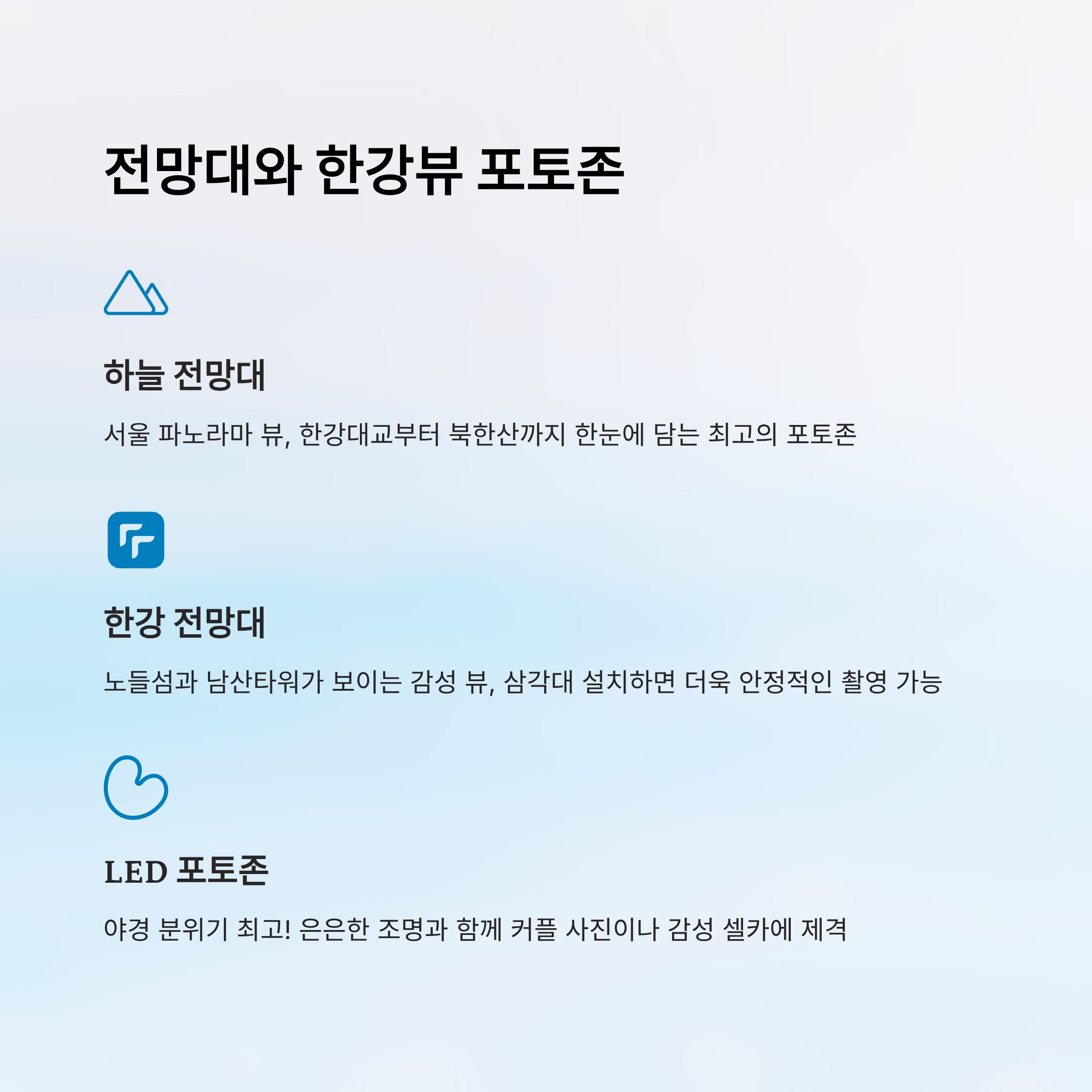 전망대에서 볼 수 있는 뷰는 한강대교, 노들섬, 남산타워, 심지어 멀리 북한산까지. 위치에 따라 파노라마처럼 펼쳐지는 서울의 풍경이 정말 예술이에요. 포토존에서는 ‘한강 배경 인생샷’을 찍기 딱 좋아요. 삼각대 가져가면 더 안정감 있는 샷도 가능하답니다!