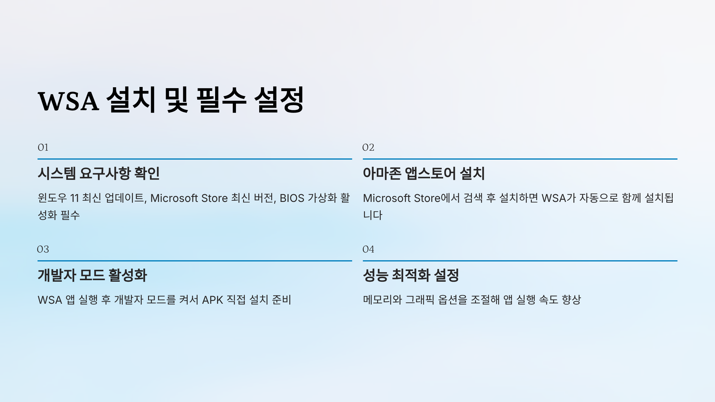 제가 생각했을 때 이 기능은 PC 환경에 새로운 생태계를 불러올 만큼 중요한 변곡점이라고 봐요. 앱 개발자들에게도 새로운 기회가 생기고, 사용자에게는 선택의 폭이 넓어졌으니까요. 다음은 본격적으로 안드로이드 앱을 실행하기 위한 WSA 설치 과정을 알려드릴게요!