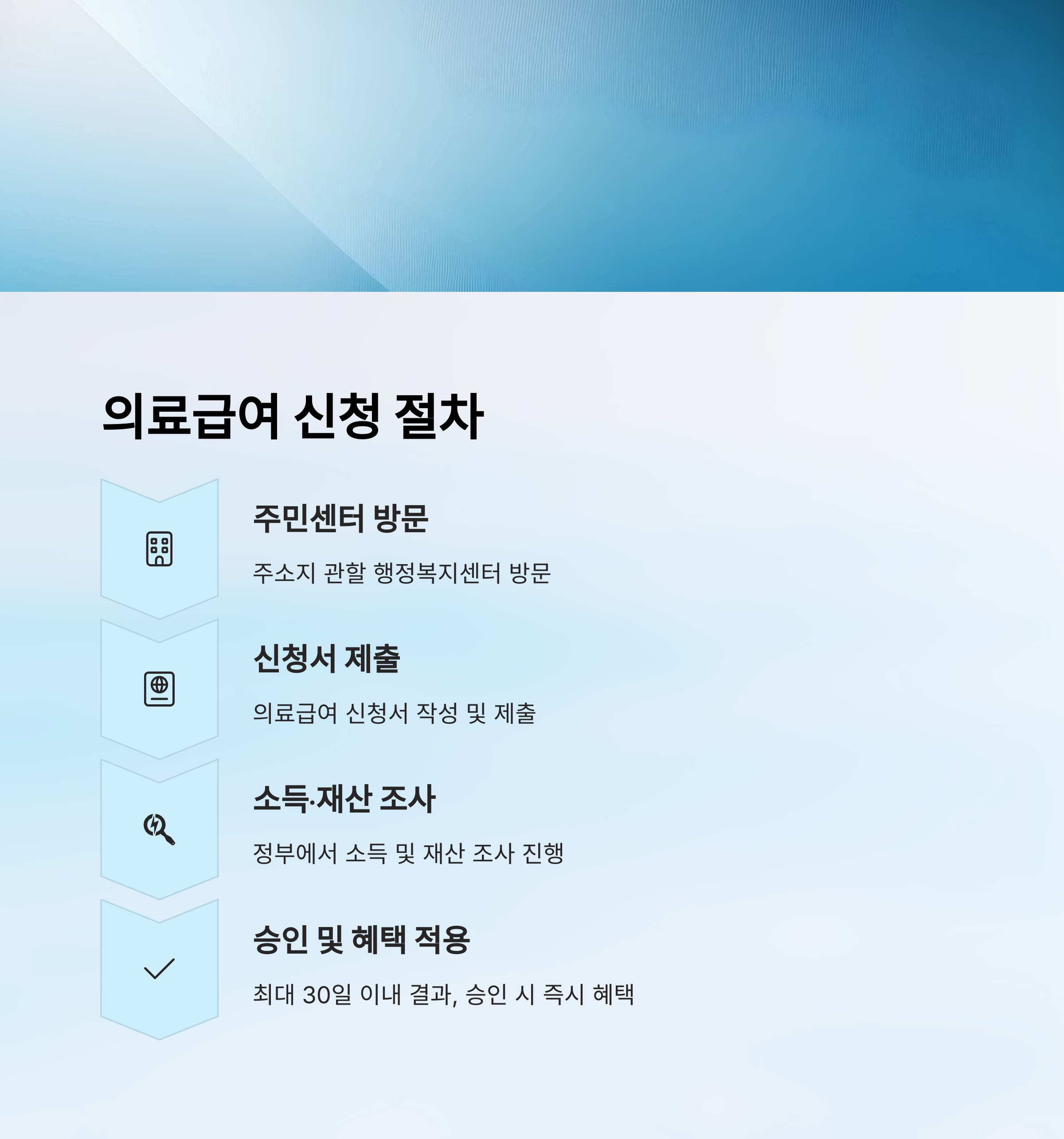 의료급여를 받으려면 **주민센터에서 신청해야 해요.** 신청 후 소득 및 재산 조사를 거쳐 최종 승인되면 의료급여 혜택을 받을 수 있어요! 🏢