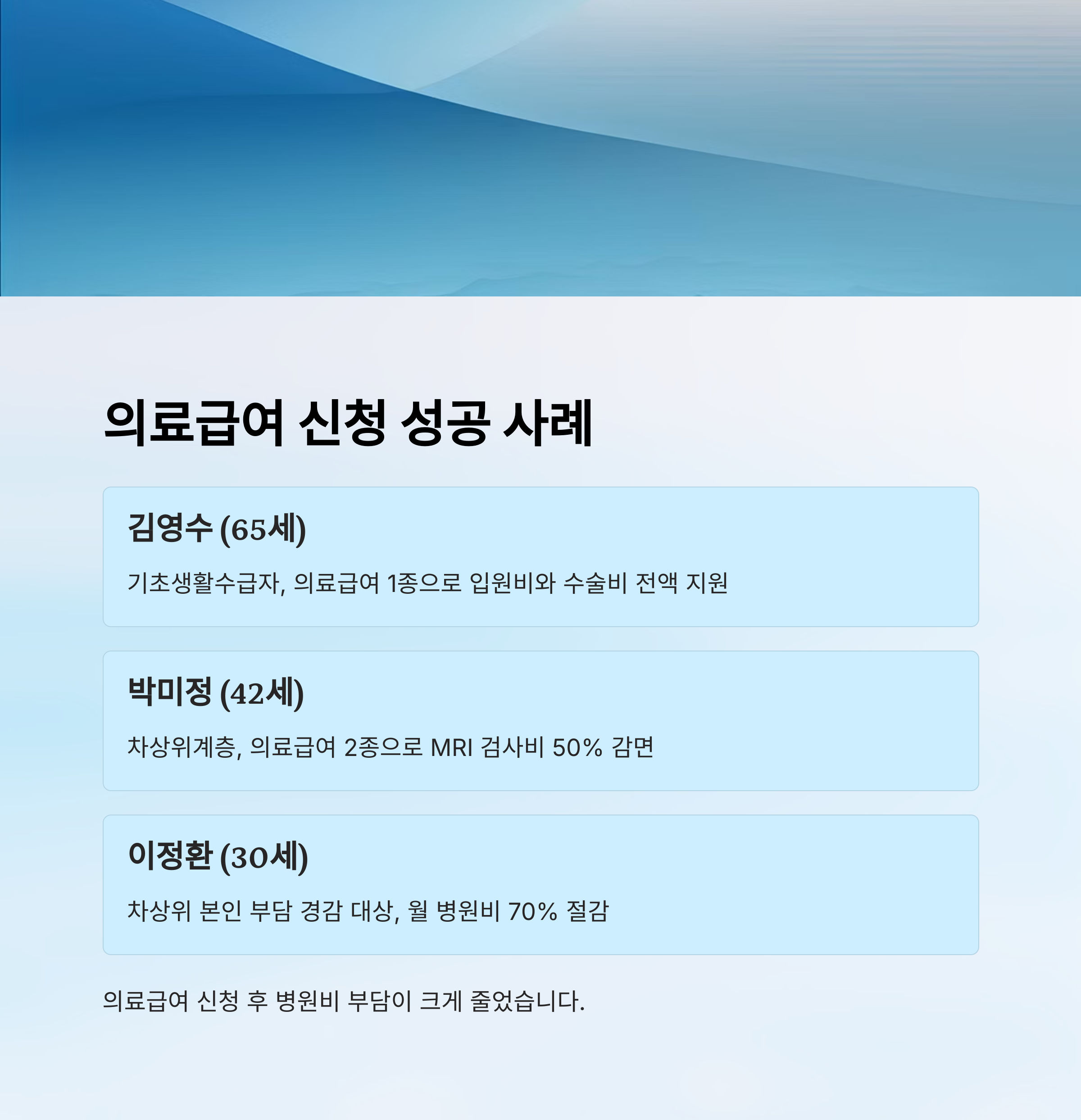 위 사례들을 보면, **의료급여 신청 후 병원비 부담이 크게 줄어든 것**을 알 수 있어요. 👍