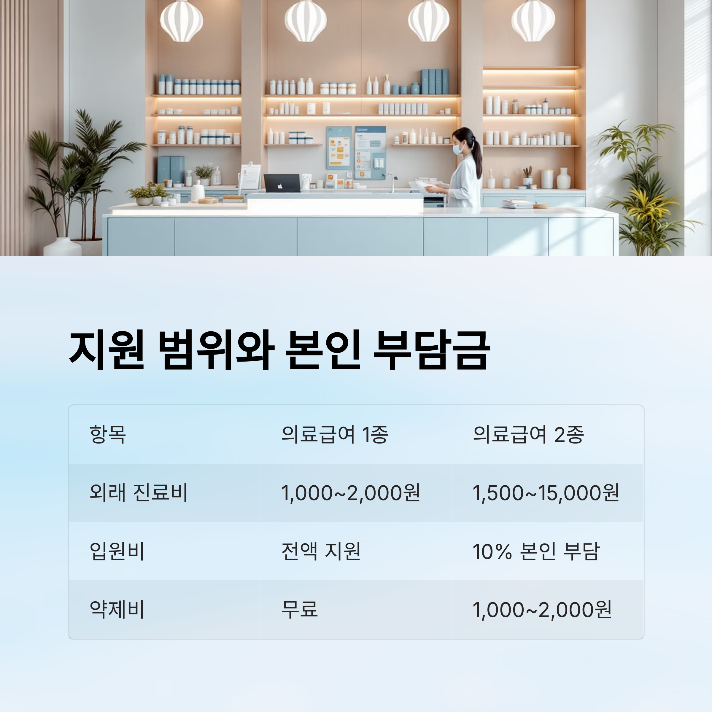 의료급여는 **진료비, 입원비, 약제비** 등을 지원하는 제도예요. 하지만 의료급여 1종과 2종에 따라 지원 범위와 본인 부담금이 달라요. ⚖️