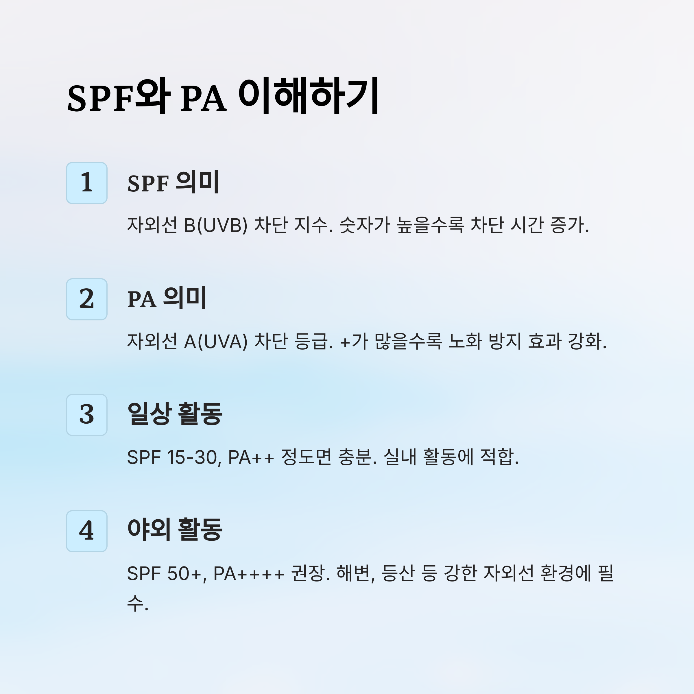 이제 SPF와 PA의 의미가 좀 더 명확하게 와닿죠? 단순히 높은 숫자를 고르기보다 나의 환경과 피부 타입에 맞는 선택이 훨씬 더 효과적이에요.