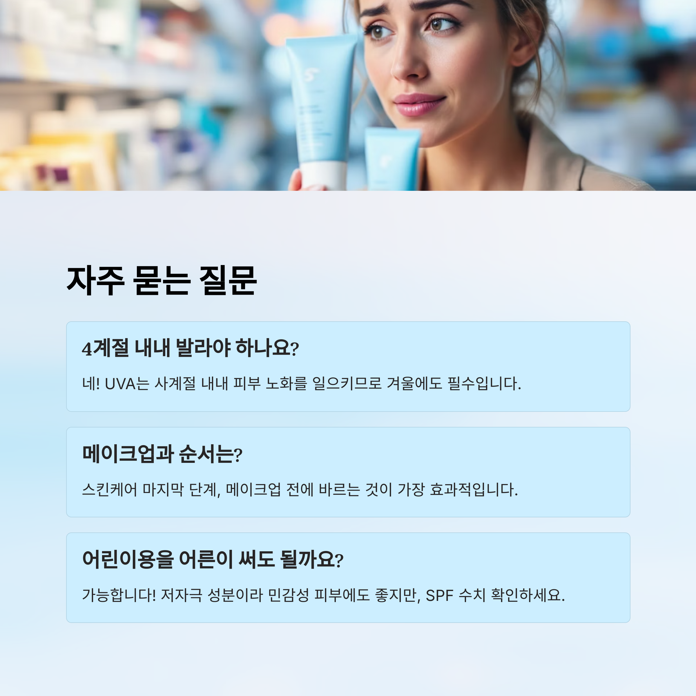 A1. 네! 자외선은 계절과 상관없이 존재해요. 특히 UVA는 사계절 내내 피부 노화를 일으킬 수 있기 때문에, 겨울에도 꼭 발라야 해요.