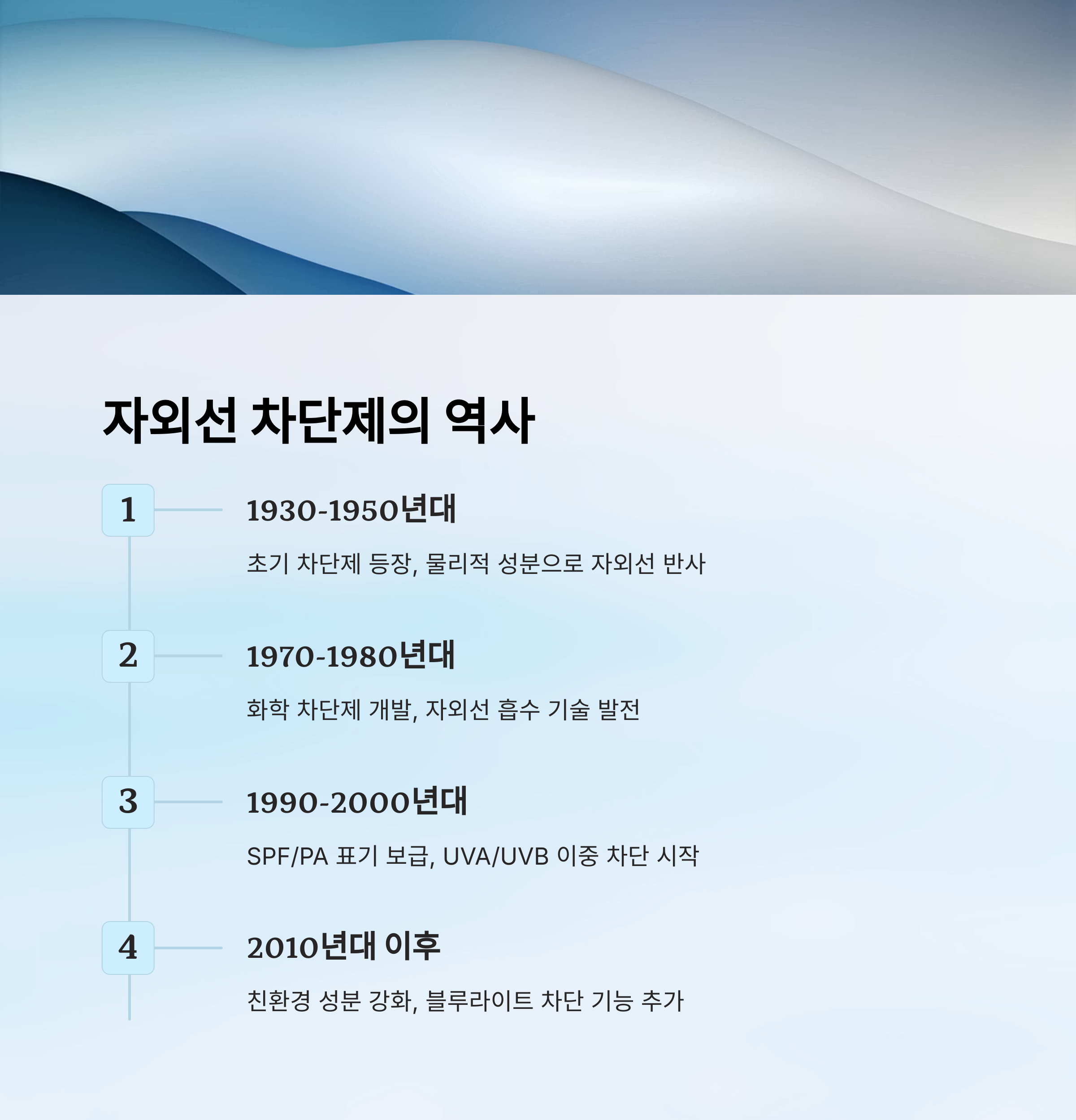이 표를 참고하면 자외선 차단제의 발전 과정을 한눈에 볼 수 있어요. 시대가 바뀌면서 피부를 지키는 방식도 함께 진화하고 있다는 점, 정말 흥미롭지 않나요?