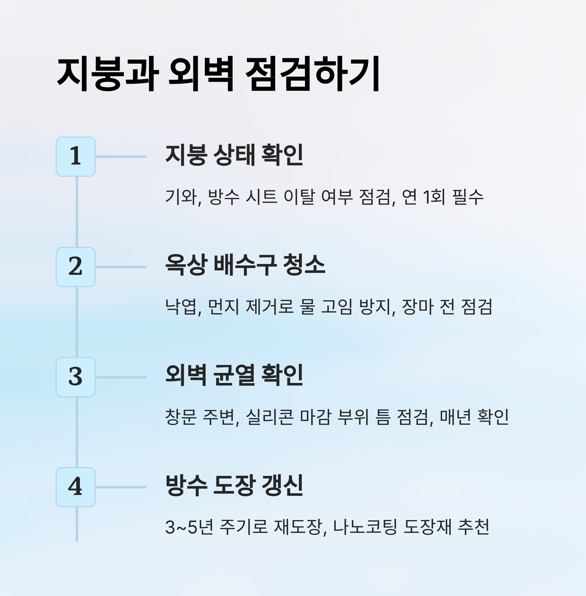 가장 먼저 할 일은 지붕의 이음새, 기와, 방수 시트 상태를 확인하는 거예요. 금이 가 있거나 이탈된 부분이 있다면 즉시 보수해야 하고, 옥상 배수구가 막혀 있는지도 꼭 확인해야 해요. 낙엽이나 먼지가 쌓이면 물이 고이면서 누수가 생길 수 있답니다.