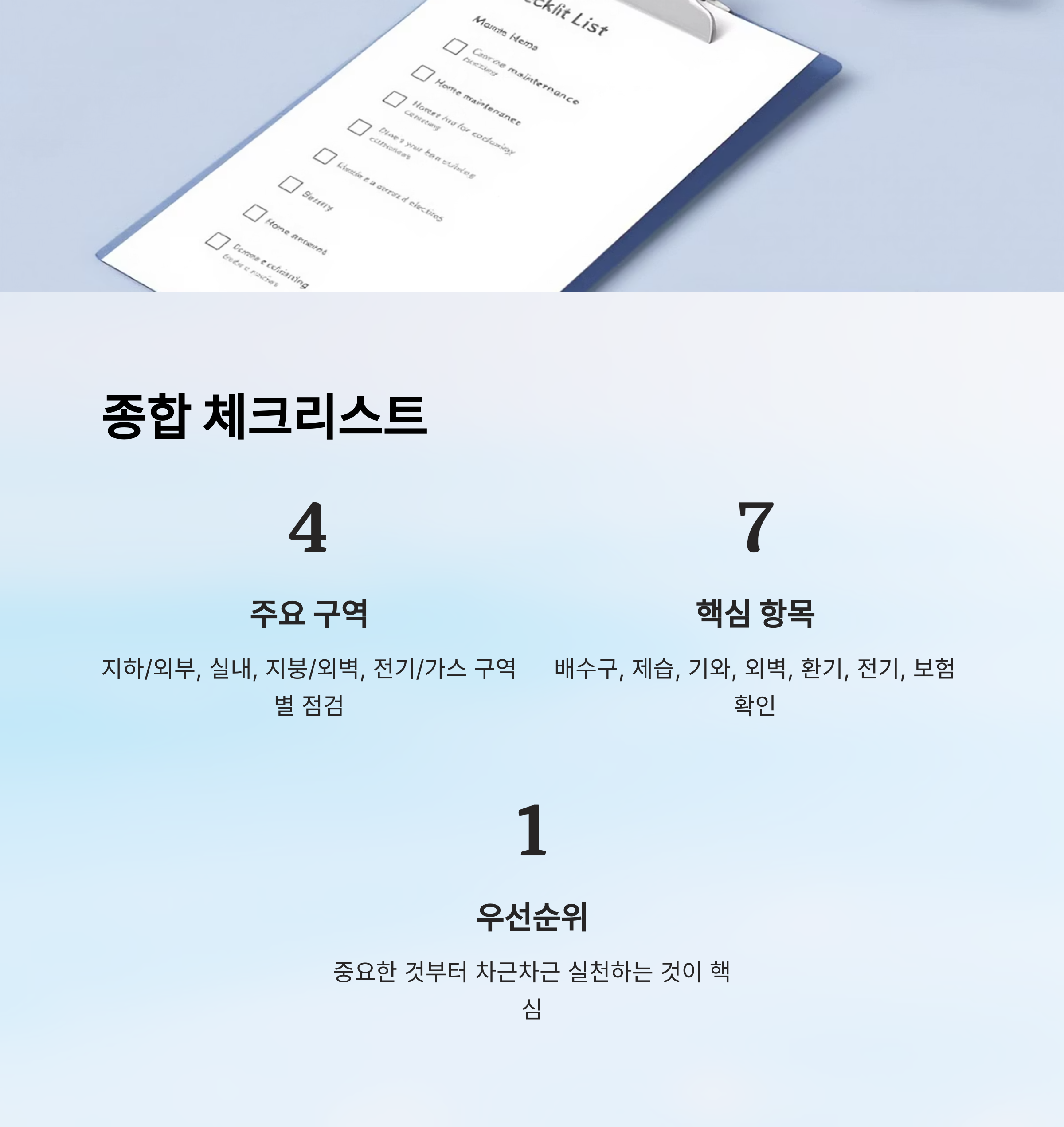 체크리스트는 공간별로 나눠서 확인하기 쉽게 구성했어요. '지하 및 외부', '실내', '지붕 및 외벽', '전기/가스' 파트로 나뉘어 있고, 각 파트마다 장마철에 꼭 확인해야 할 핵심 항목들이 정리돼 있어요.
