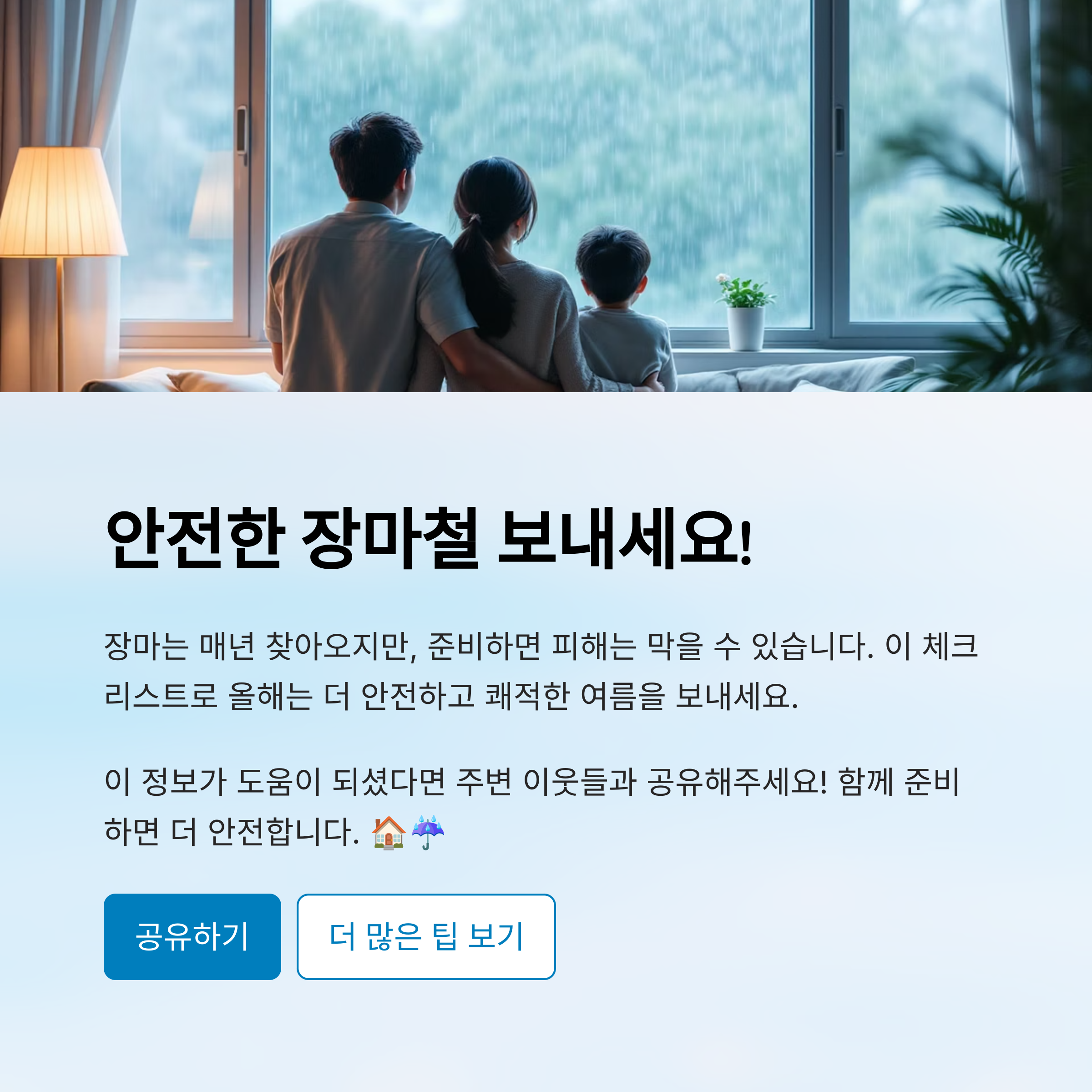 이 체크리스트는 장마뿐 아니라, 여름철 전체에 두고 활용할 수 있는 내용이에요. 가족이나 친구들에게도 공유해서 함께 대비하면 더 좋겠죠? ☔