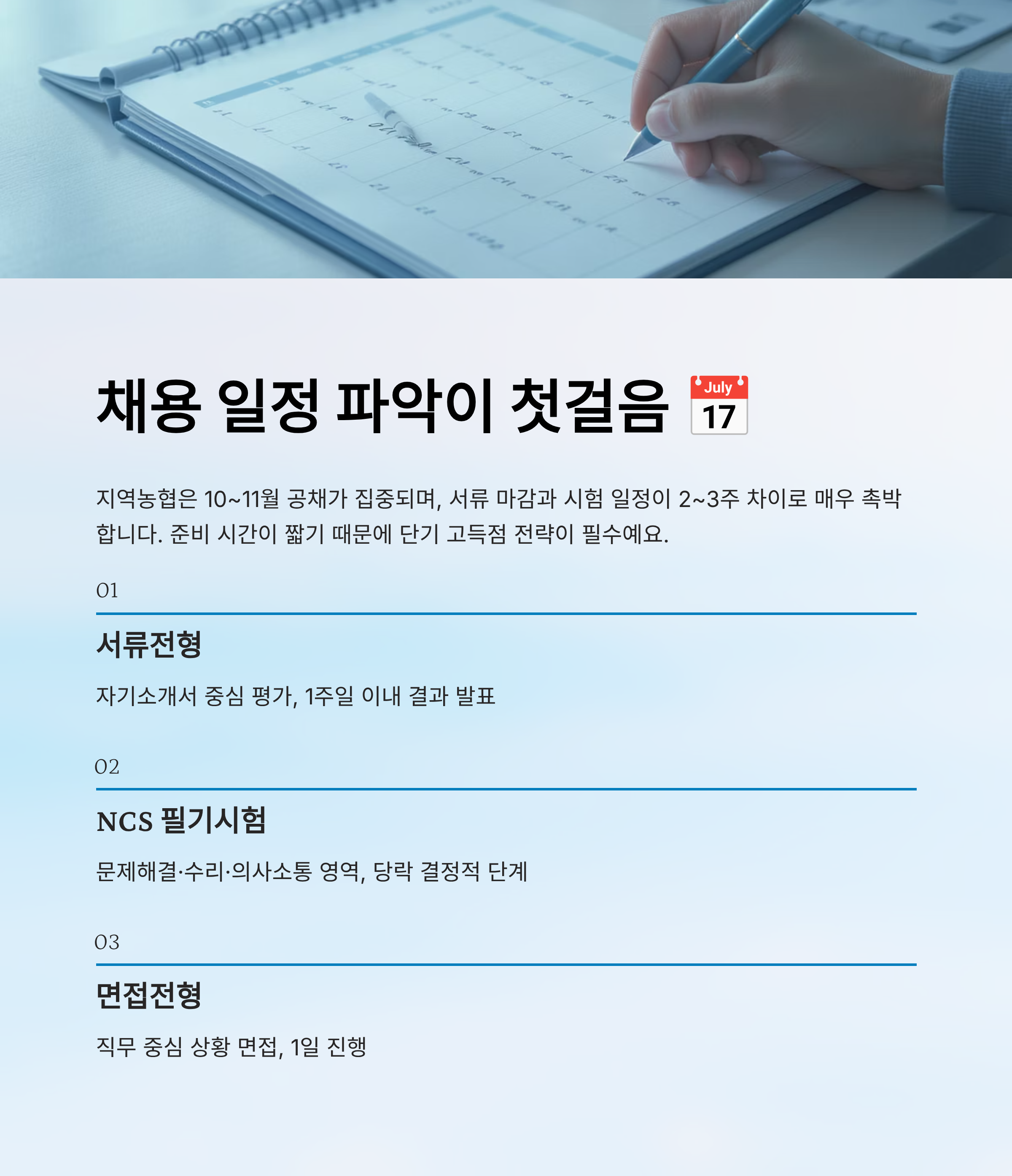 채용은 빠르게, 준비는 철저하게! 농협 채용은 정형화된 틀이 있기 때문에, 일정표와 절차를 파악하면 불안감도 많이 줄어요. 특히 '채용 일정 캘린더'를 만들어 두면 실수 없이 대비할 수 있답니다.