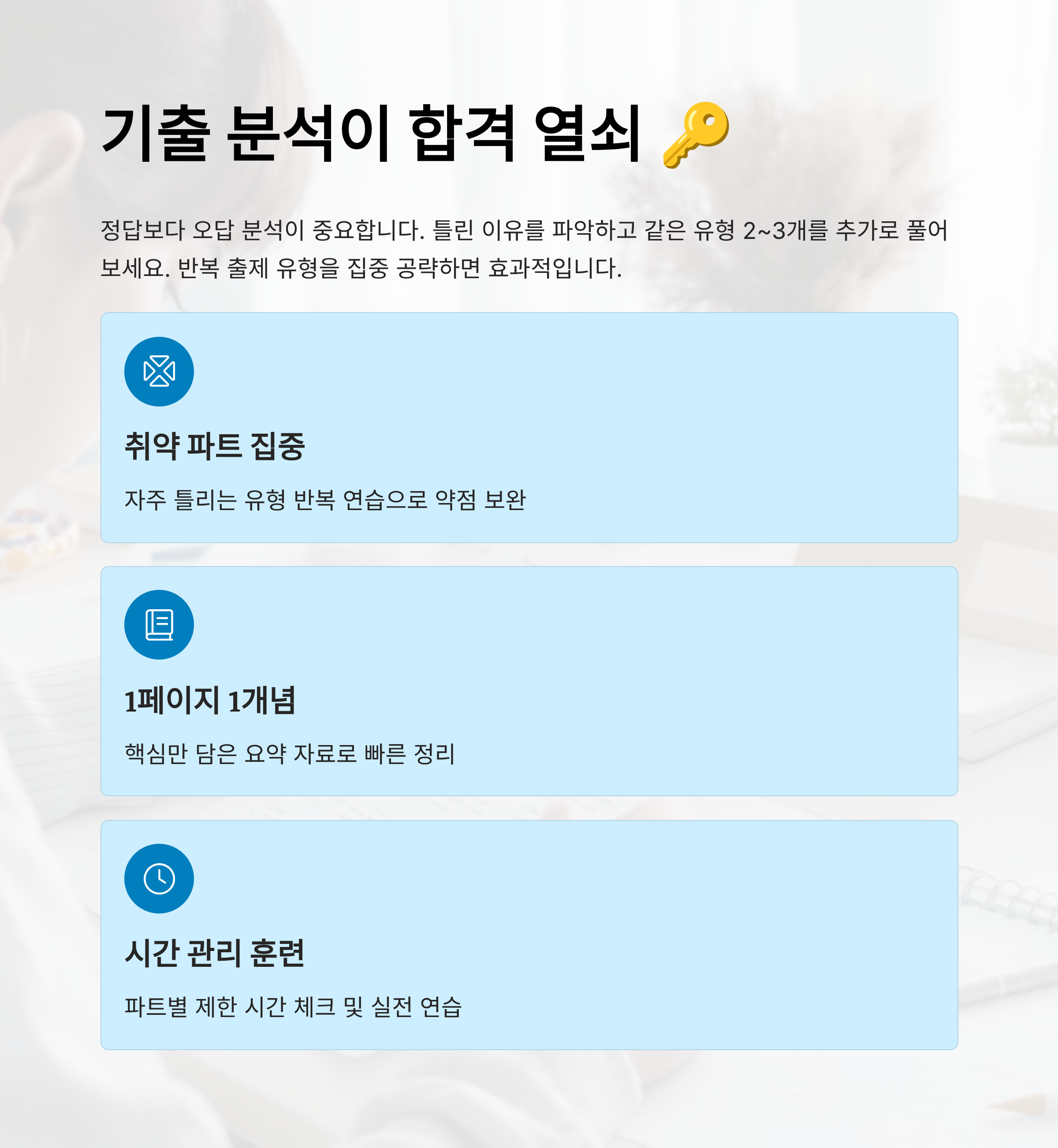 시간이 부족할 때는 양보다는 ‘밀도’가 중요해요. 그래서 오늘은 실제 수험생들이 극찬한 고효율 요약 자료와 기출 분석법을 소개할게요. 이걸로 핵심만 빠르게 훑고, 자주 나오는 유형 위주로 대비하면 돼요!
