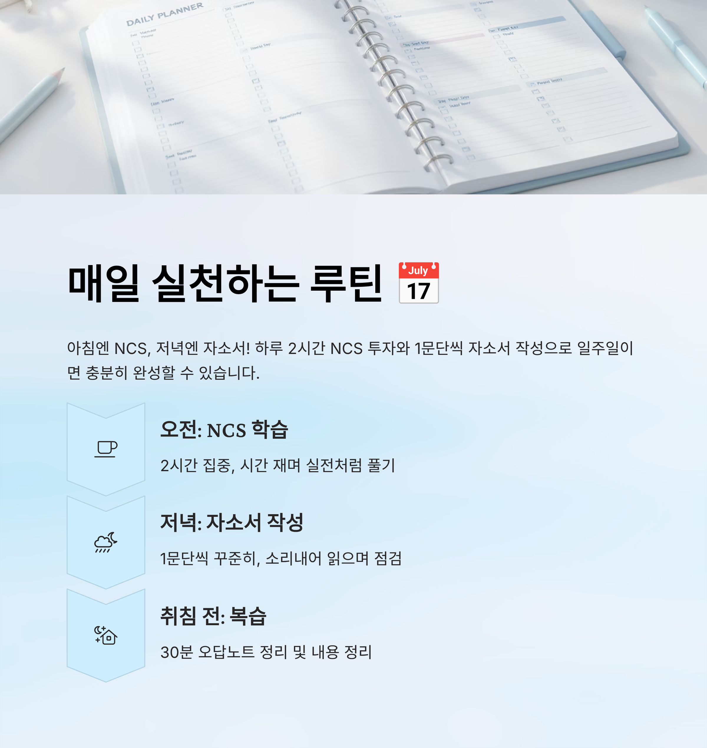 이 루틴은 NCS + 자소서 모두를 함께 준비할 수 있도록 구성했어요. 아침엔 NCS, 저녁엔 자소서. 단순하지만 효과는 확실해요. 특히 자소서는 하루에 1문단씩만 써도 일주일이면 충분히 완성할 수 있답니다.