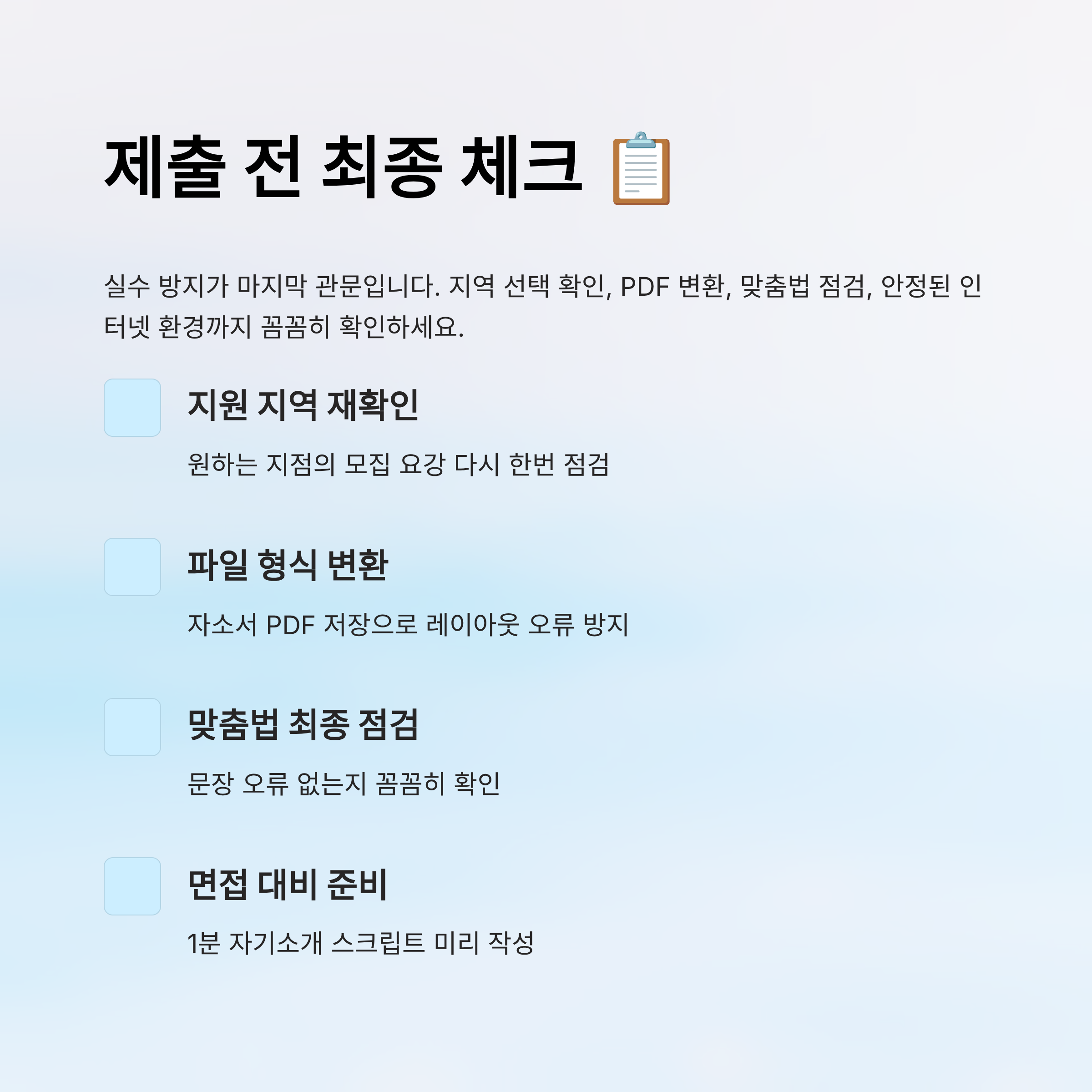 모든 준비를 마쳤다면, 마지막 단계는 ‘실수 방지’예요! 예상보다 많은 지원자들이 지원서를 시간 초과로 못 내거나, 첨부파일 오류, 항목 누락 등으로 탈락하는 일이 생기거든요. 너무 아깝잖아요? 😢