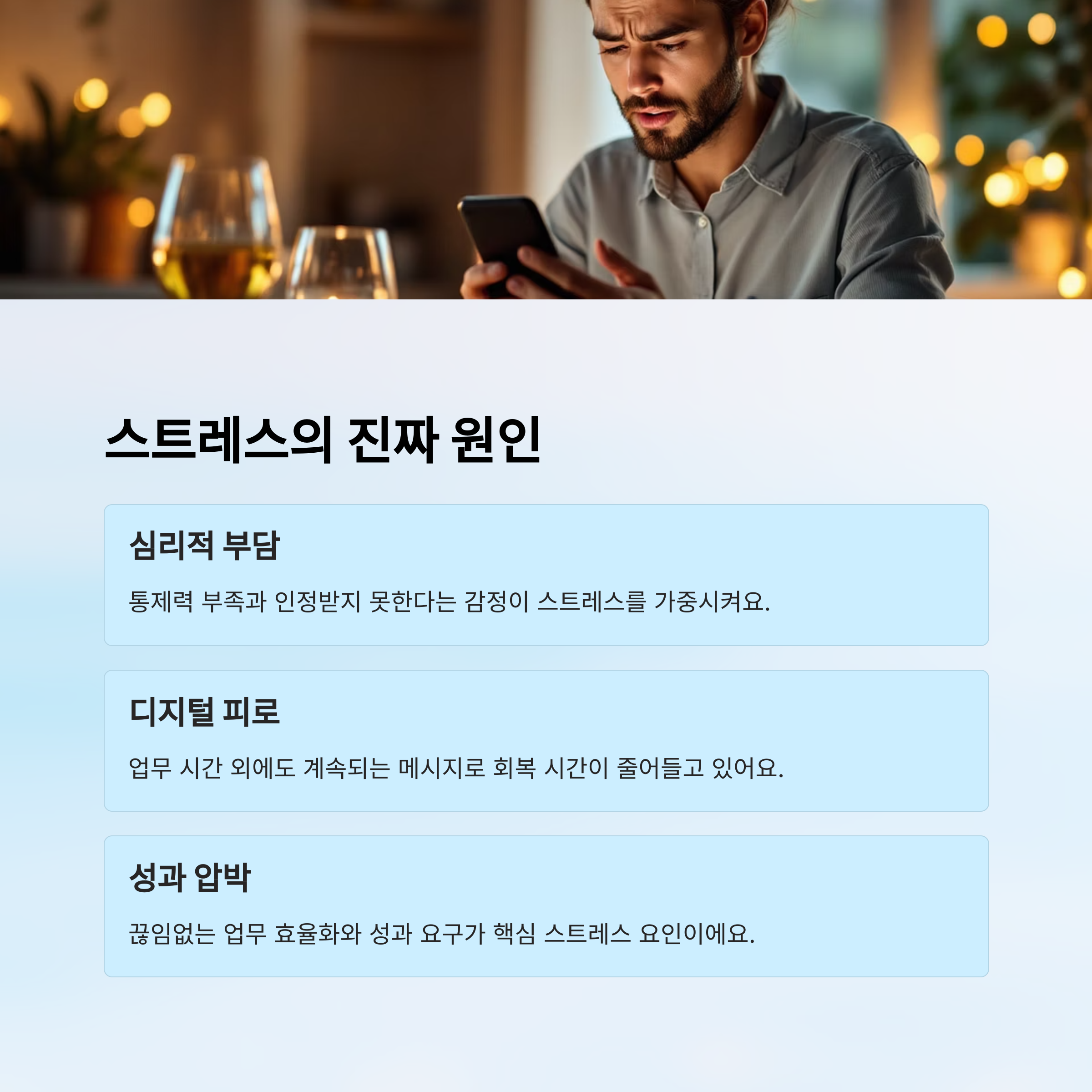 예전에는 단순히 상사의 눈치를 보거나 실수하지 않는 것이 중요했다면, 요즘은 끊임없는 업무 효율화, 성과 압박, 일과 삶의 균형 붕괴 등이 핵심 스트레스 요인이에요. 게다가 디지털 커뮤니케이션의 발달로 인해 업무 시간 외에도 업무 메시지를 받는 일이 늘어나면서, 개인의 회복 시간도 줄어들고 있어요.