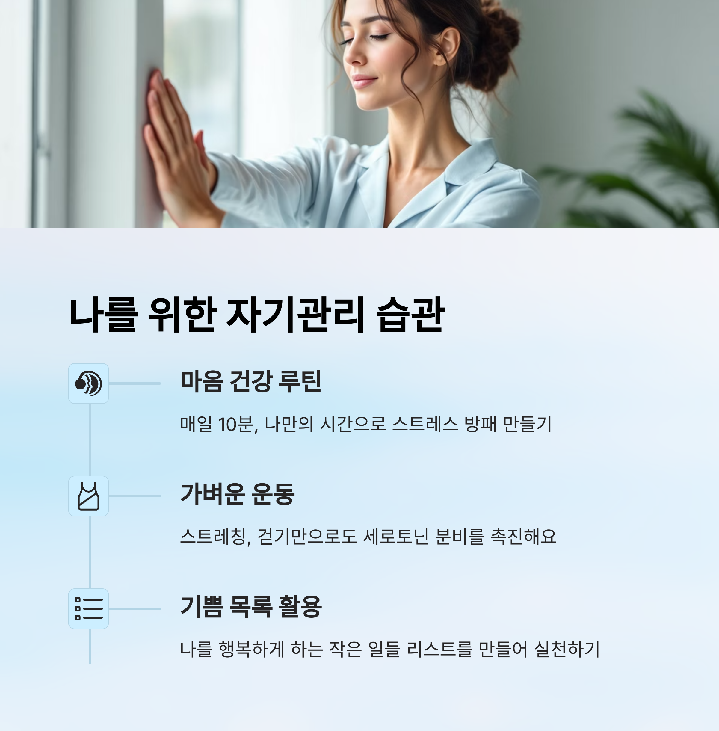 자기관리는 절대 거창하지 않아도 돼요. 중요한 건 꾸준함이에요. 오늘은 차 한 잔, 내일은 10분 산책, 모레는 친구에게 안부 인사 하나. 이런 사소한 실천들이 결국 나를 지켜주는 힘이 된답니다 🍀