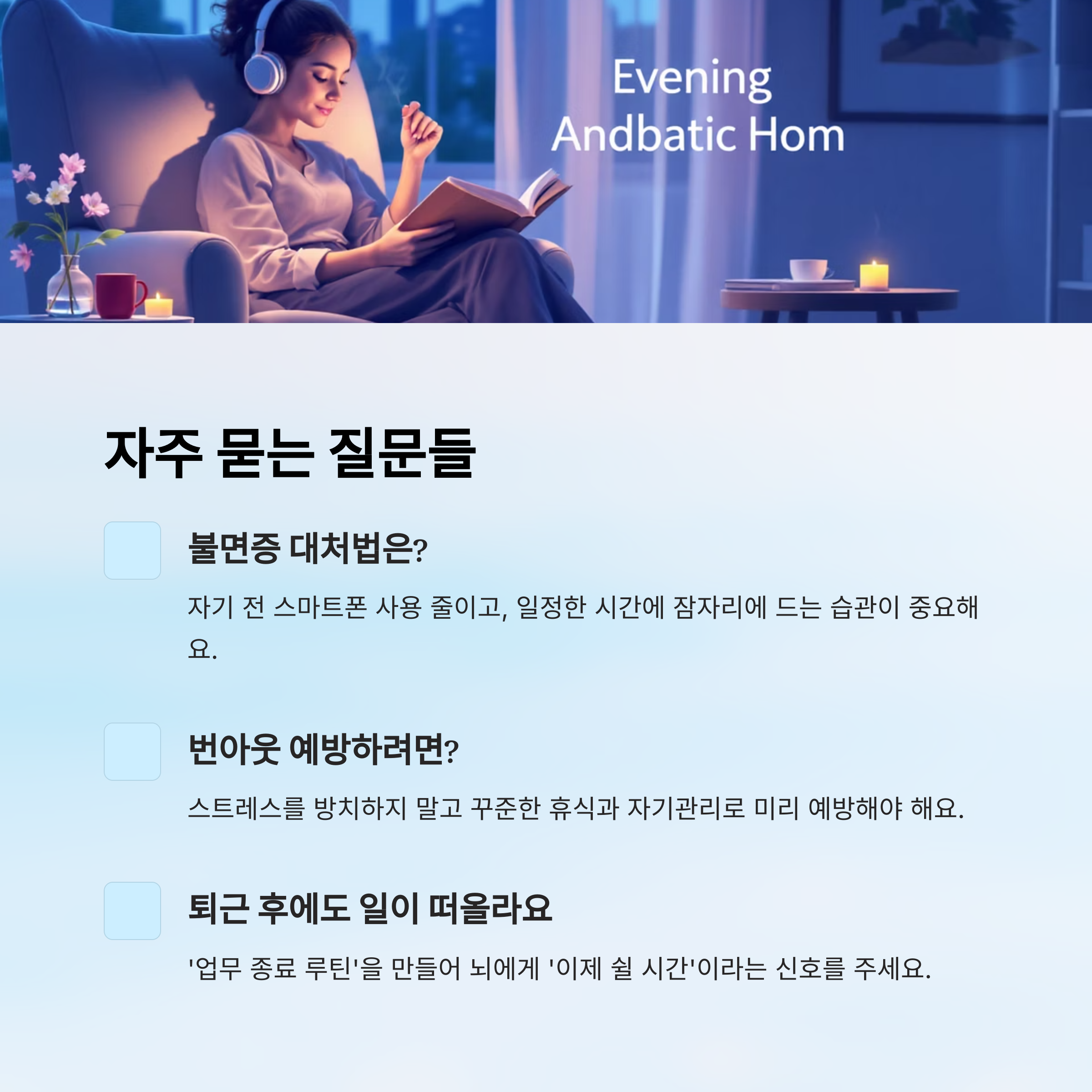 A6. '업무 종료 루틴'을 만들어보세요. 퇴근 후 정리노트 작성, 산책, 명상 같은 행동으로 뇌에게 '이제 쉴 시간'이라는 신호를 줘야 해요.