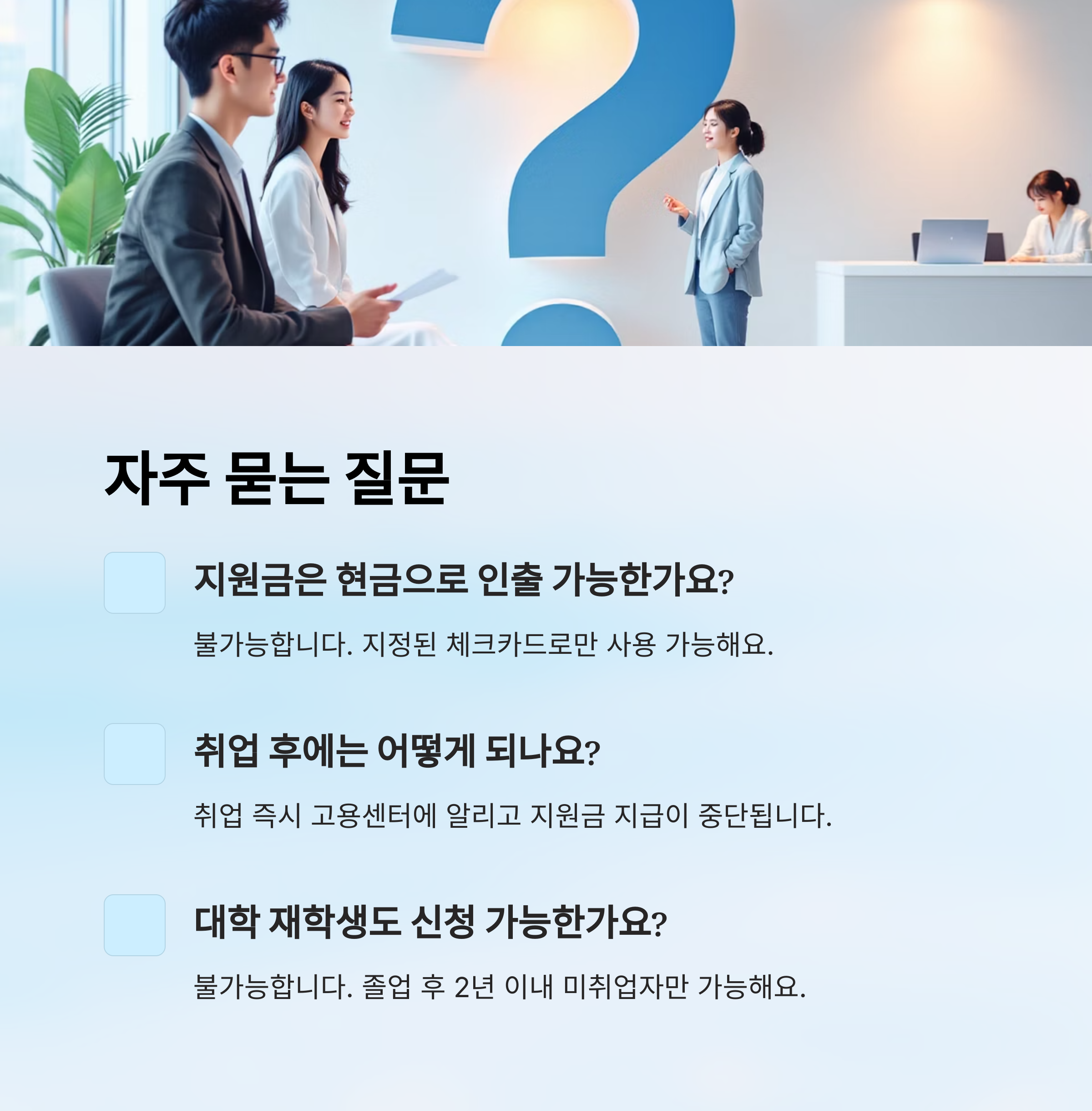 또한, 현재 취업 중이거나, 창업을 준비 중인 경우, 또는 정부에서 제공하는 다른 취업 지원 프로그램에 참여하고 있다면 중복으로 지원받을 수 없어요. 만약 불법으로 지원금을 받게 되면 환수 조치가 이루어지니 주의해야 해요!