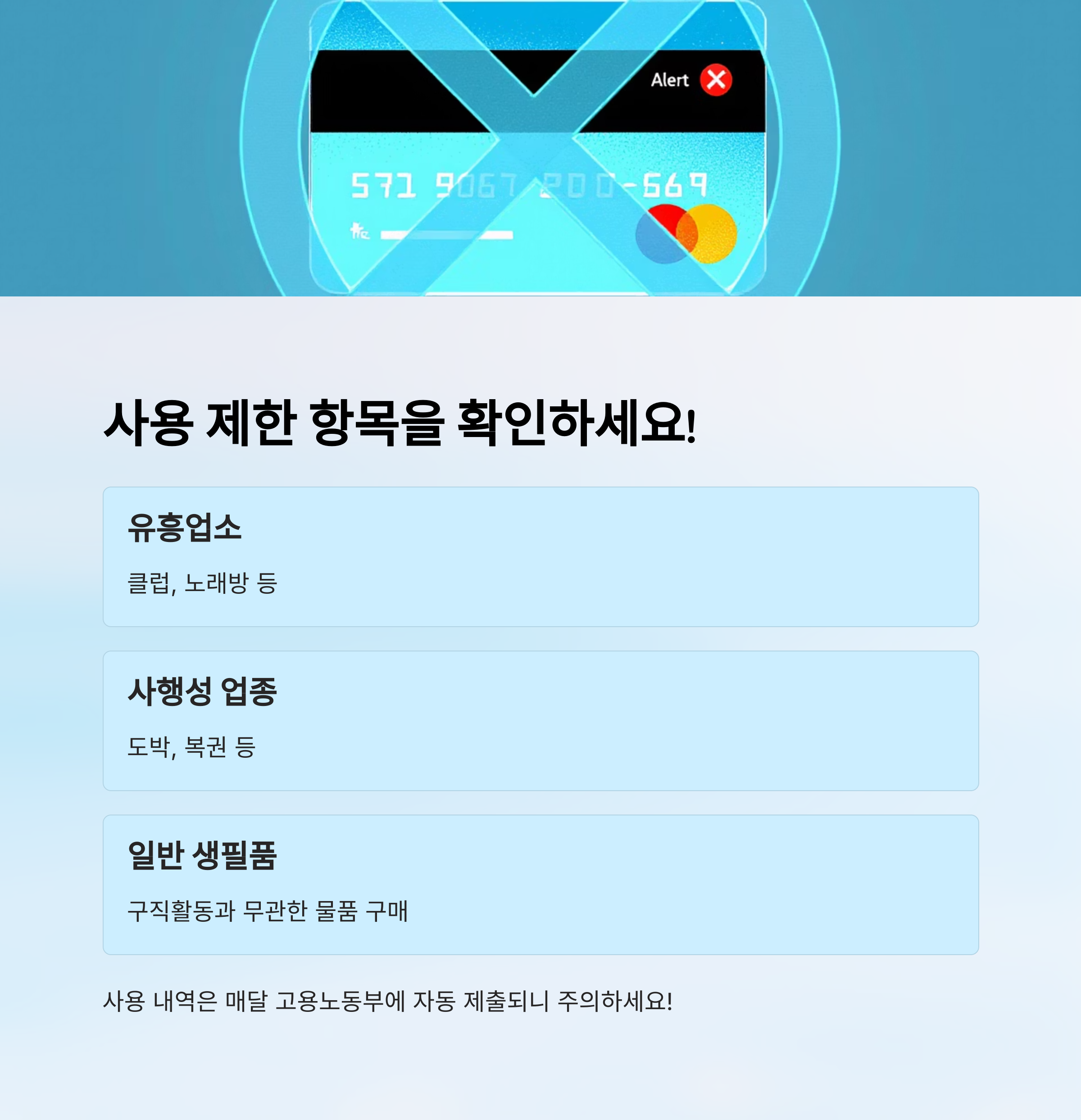 또한, 사용 내역은 매달 고용노동부에 자동으로 제출되기 때문에 투명하게 사용해야 해요. 만약 부적절하게 사용했을 경우 환수 조치가 이루어질 수 있어요. 이를 방지하려면 사용 가능한 항목을 미리 확인하고 계획적으로 사용하는 것이 좋아요!