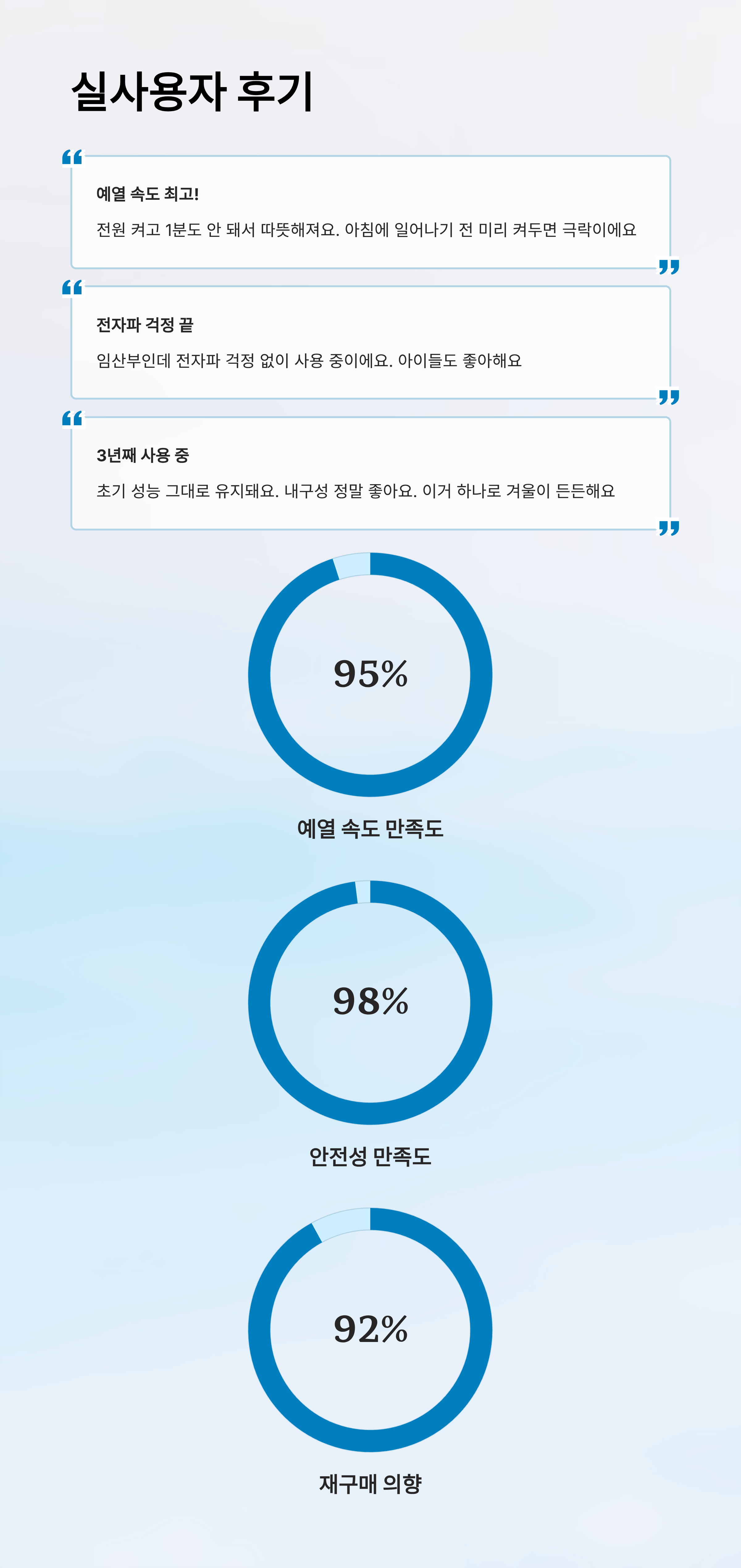 브랜드 철학 중 하나는 "따뜻함에 기술을 더하다"인데, 이 슬로건처럼 단순한 온열 제품 그 이상을 전달하고자 하는 의지가 엿보여요. 특히 가족 모두가 안심하고 사용할 수 있는 ‘무자극 저자극’ 구조는 어린아이부터 노년층까지 폭넓은 사용자를 위한 배려가 느껴져요.